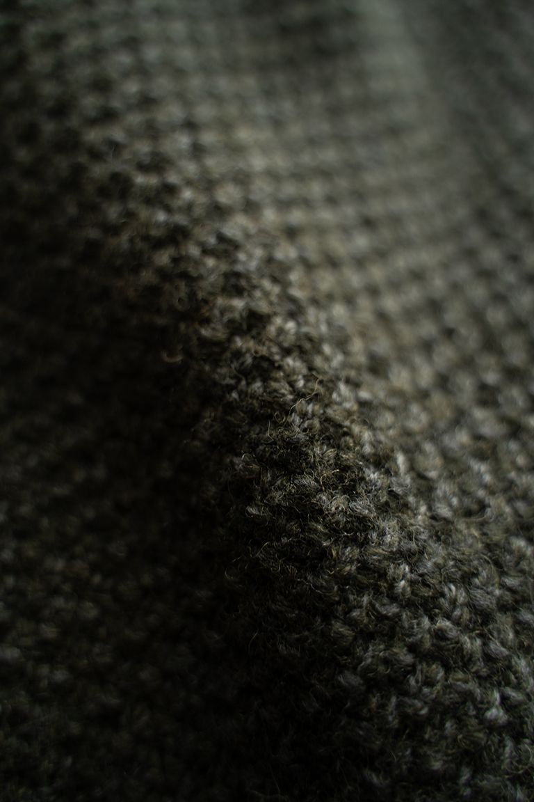 こちらの作品では、英国羊毛とフレンチメリノを撚り合わせて5Gで編み上げた生地を使用しております。