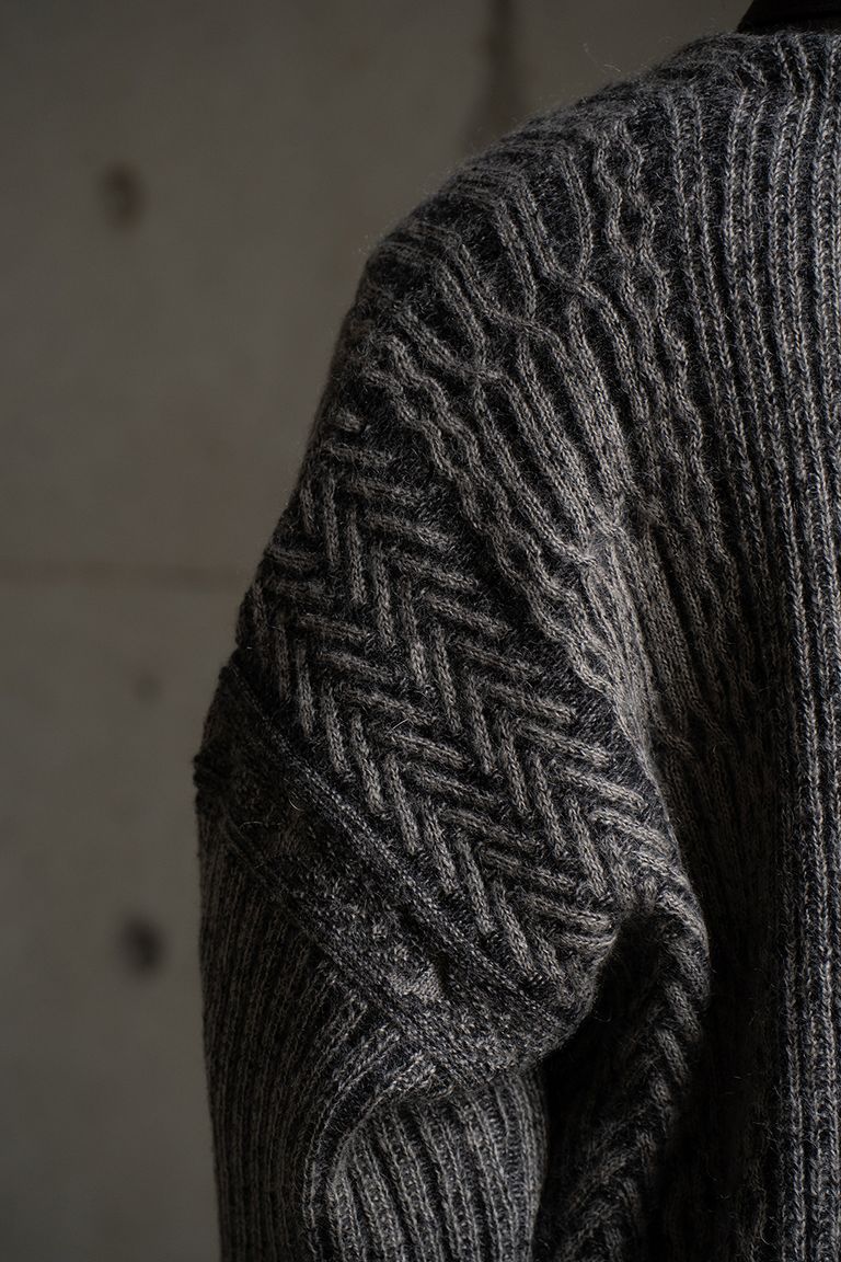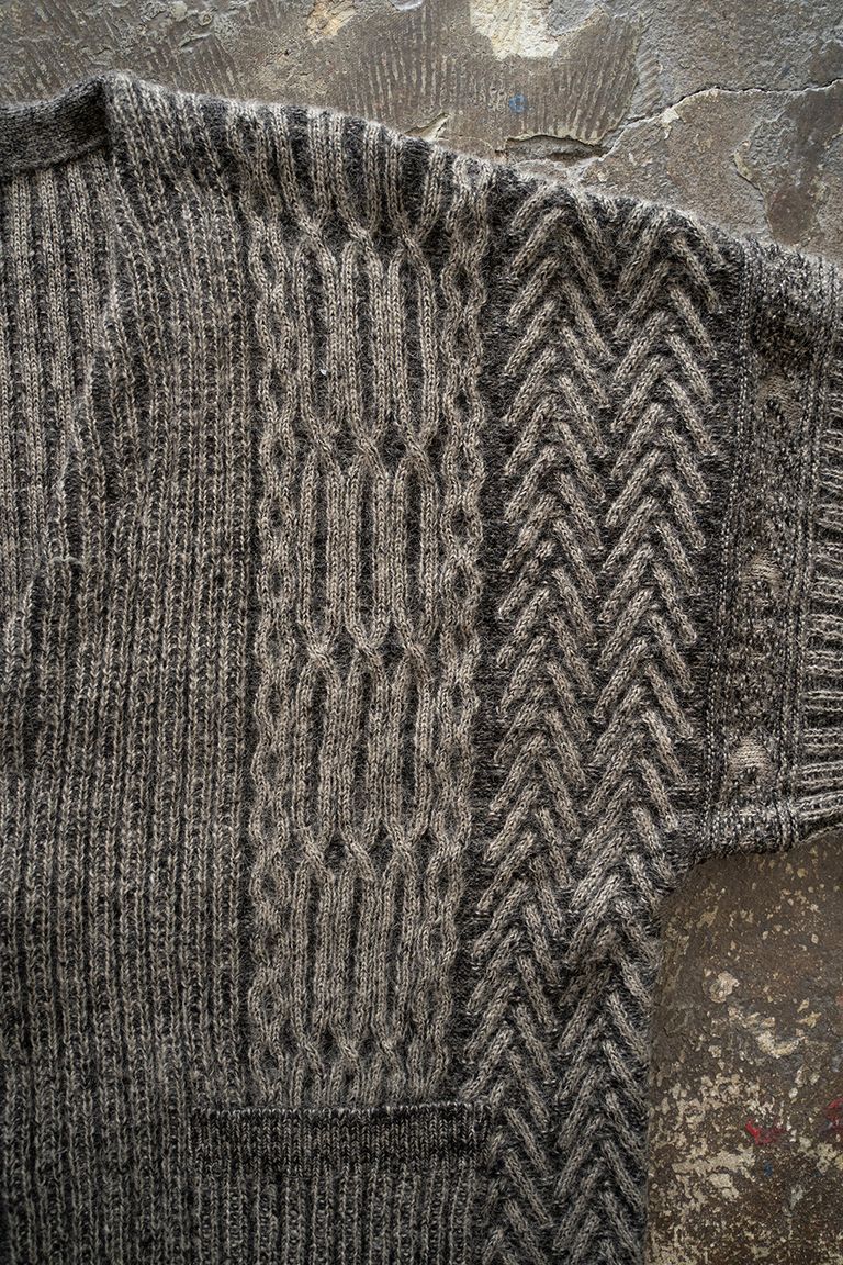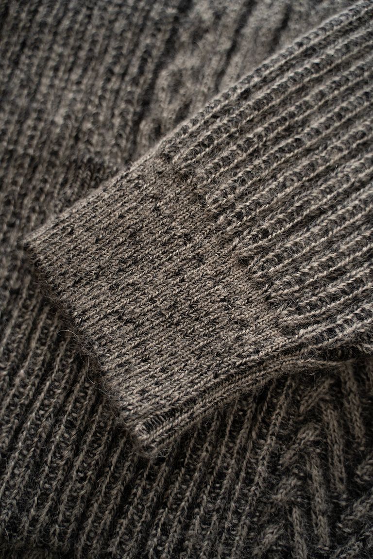 身頃中央と袖の柄で雪に覆われた畝や畦道を表し、身頃横のケーブル柄で轍を表し、身頃脇の柄で雪が積もった木々を表しております。