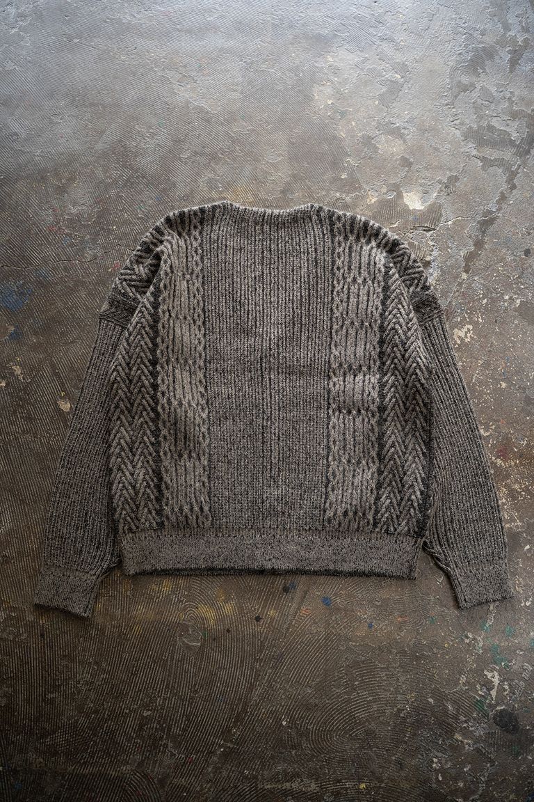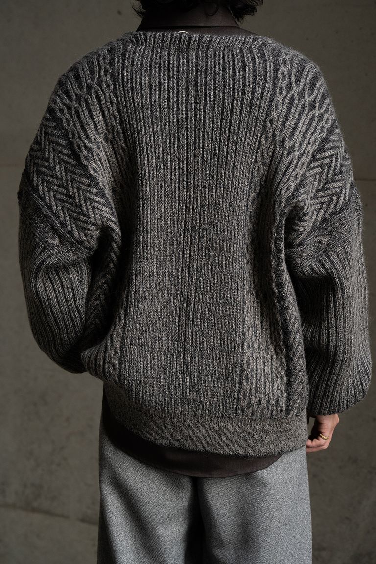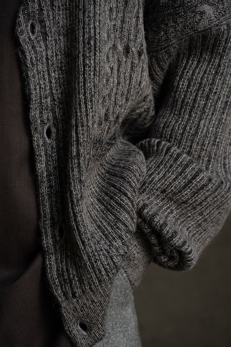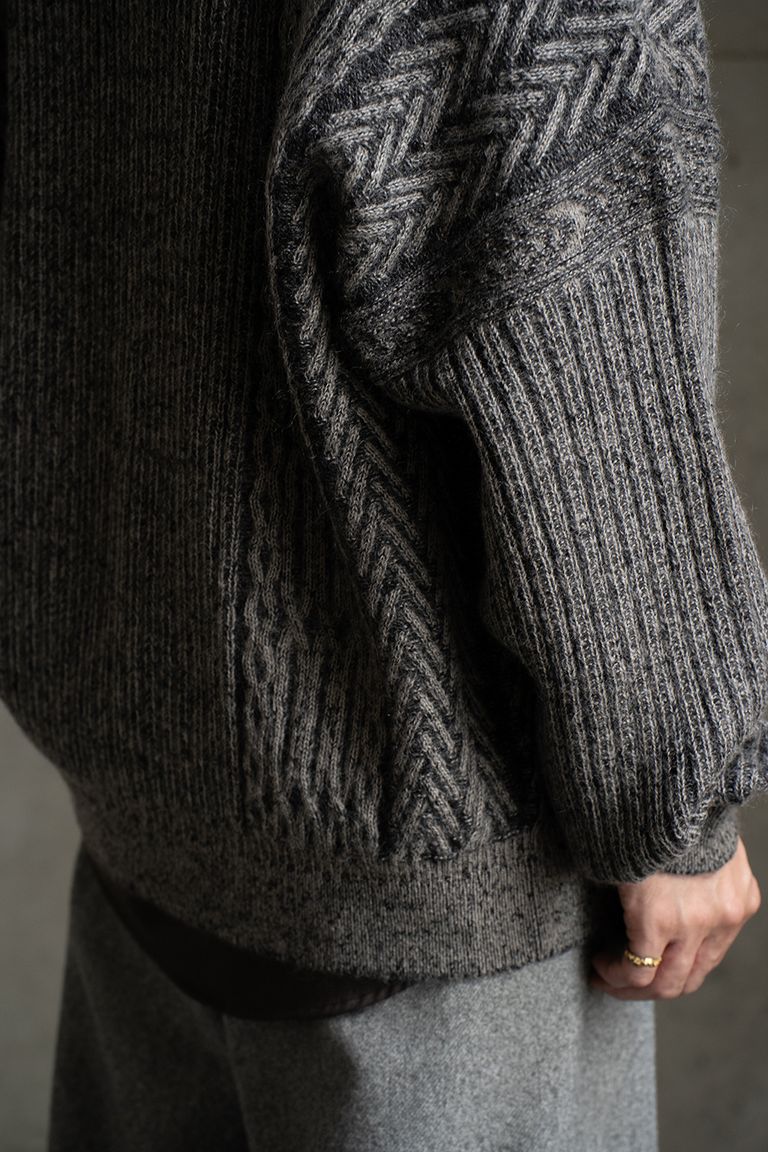 身頃中央と袖の柄で雪に覆われた畝や畦道を表し、身頃横のケーブル柄で轍を表し、身頃脇の柄で雪が積もった木々を表しております。