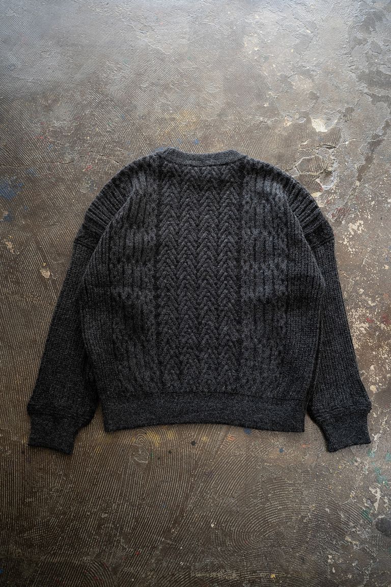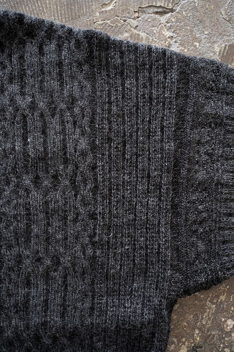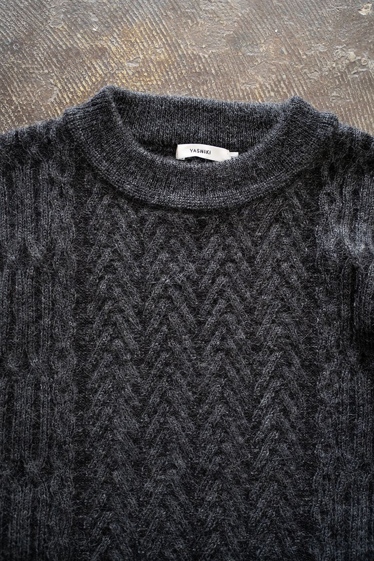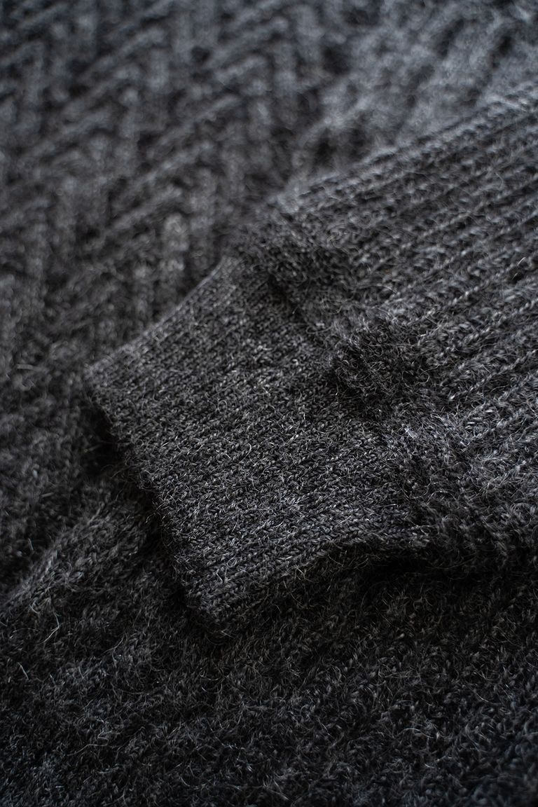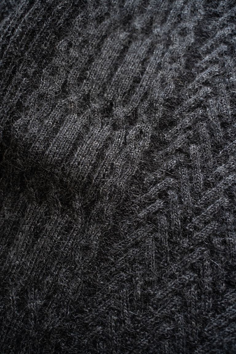 身頃中央の柄で雪が積もった木々を表し、身頃横のケーブル柄で轍を表し、身頃脇と袖の柄で雪に覆われた畝や畦道を表しております。