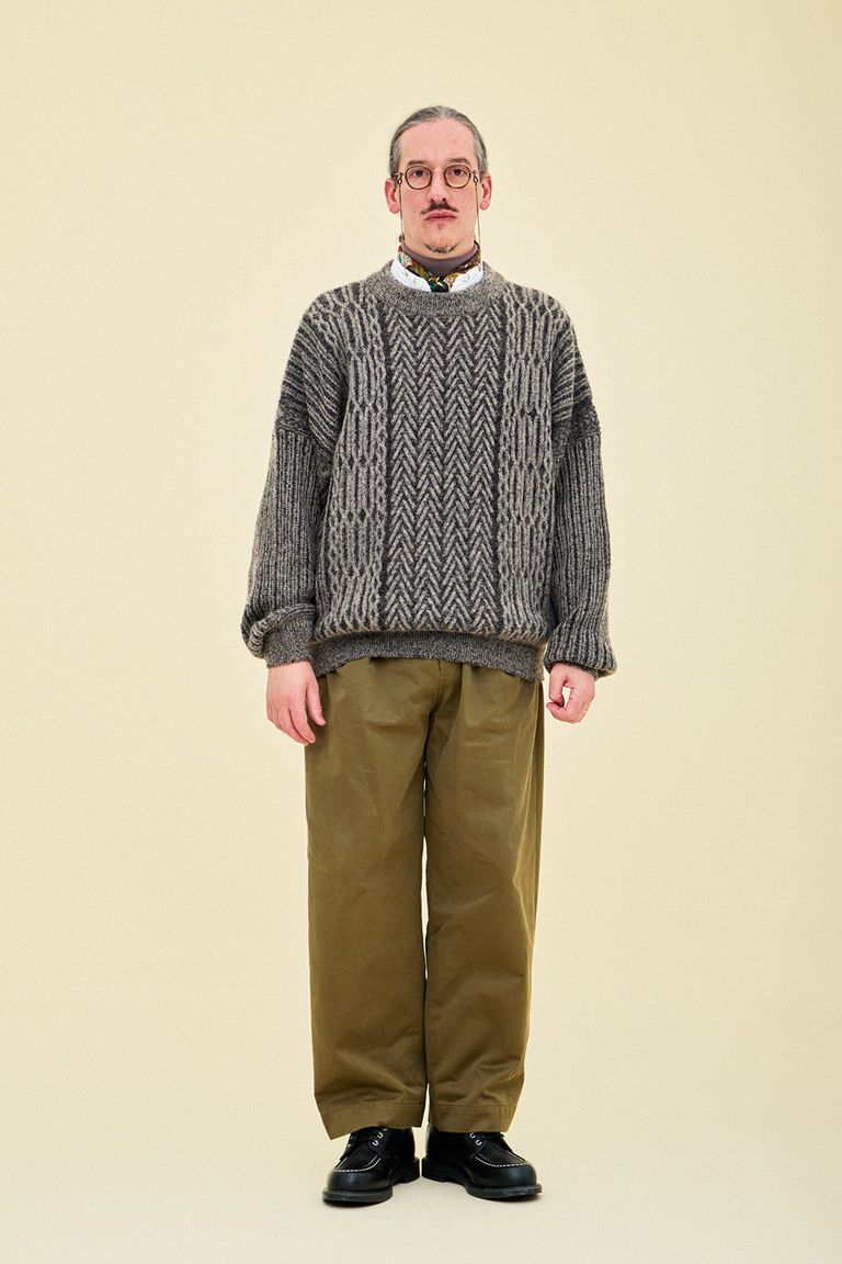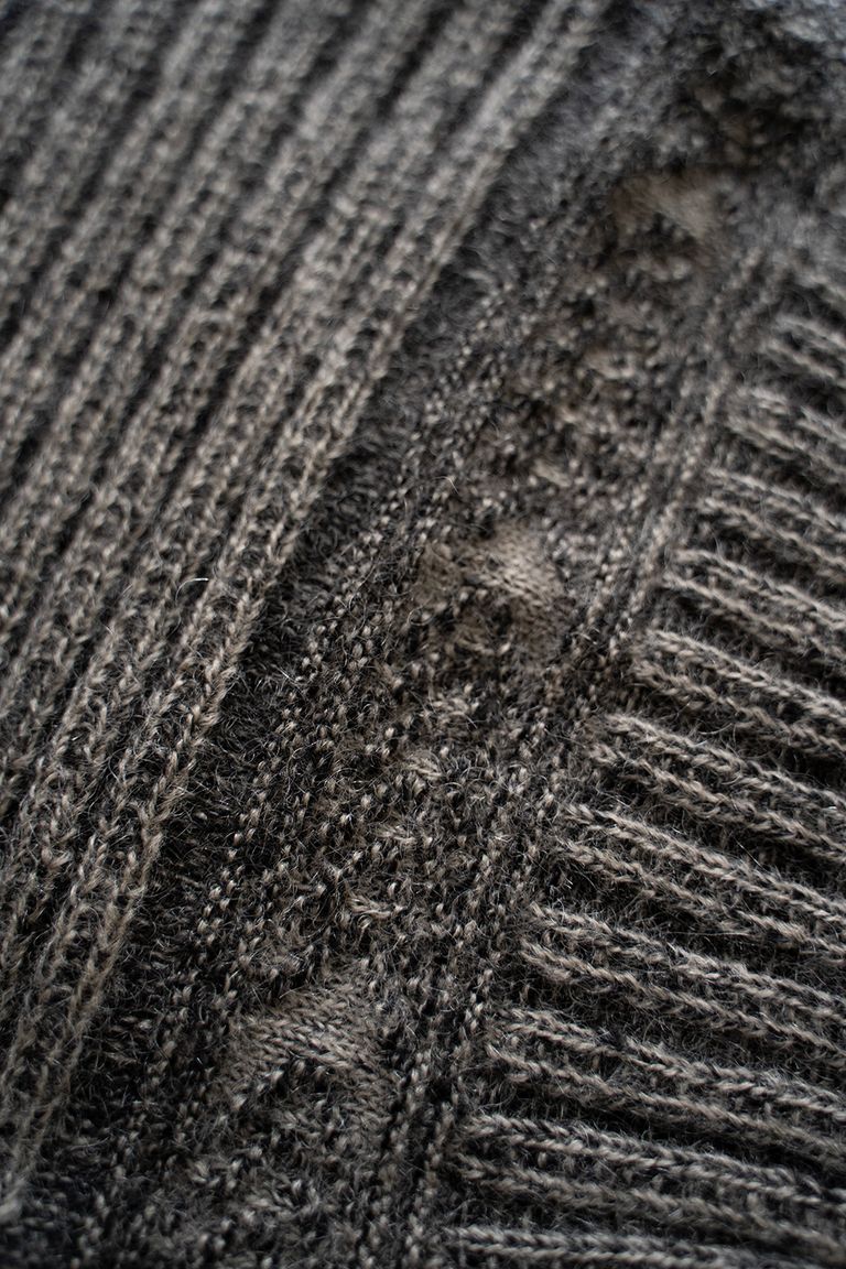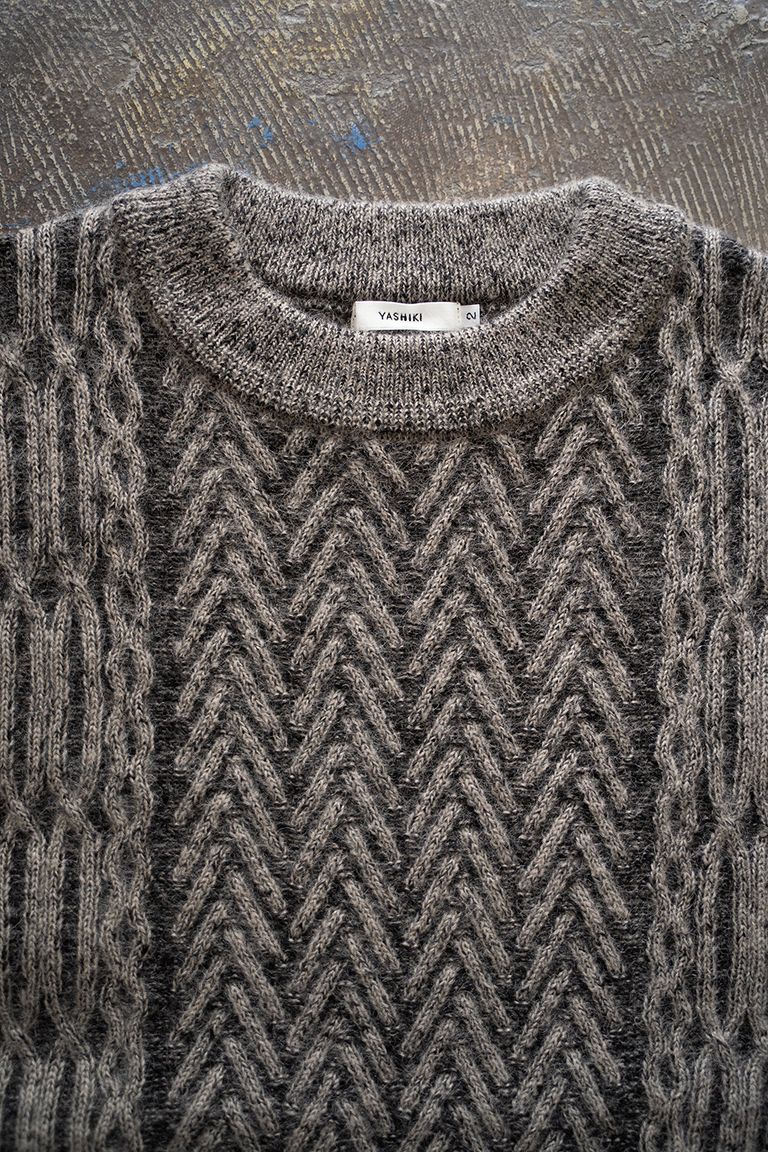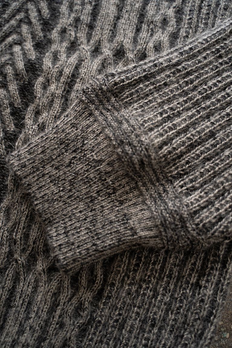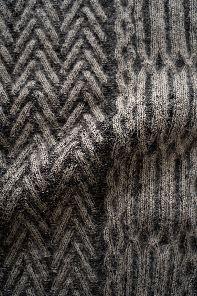 身頃中央の柄で雪が積もった木々を表し、身頃横のケーブル柄で轍を表し、身頃脇と袖の柄で雪に覆われた畝や畦道を表しております。