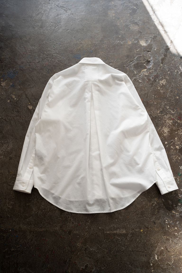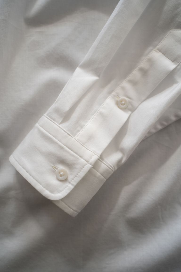 JUHAのシャツのアイコンとも言える背面に施されたインボックスプリーツとこちらのシルエットにより、前述した生地のしなやかなドレープ感が活きるデザインに仕上げております。