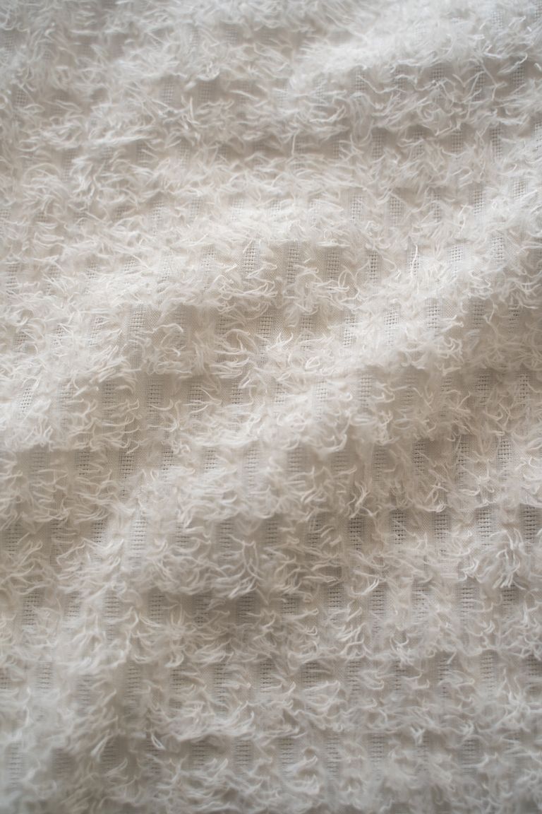 こちらの作品では、ふわふわとした毛足が特徴的なポリエステル100%のカットジャカード(※注1)生地を使用しております。