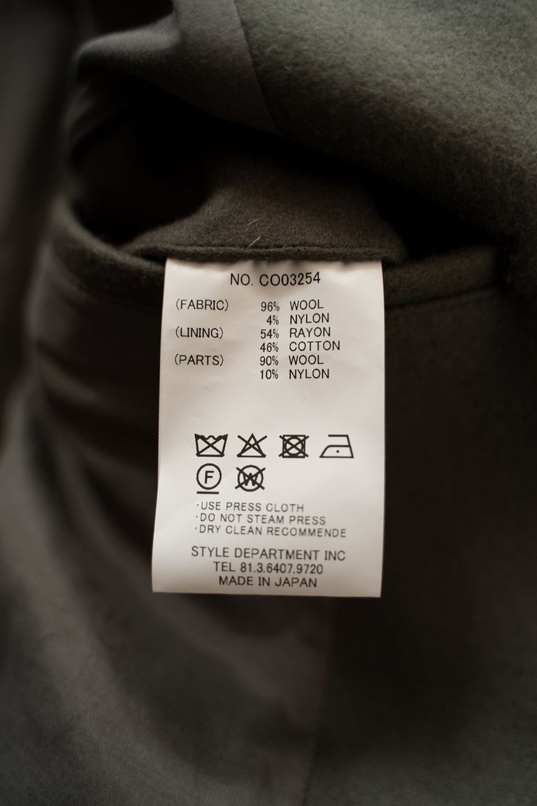 表地:ウール96% ナイロン4% 身頃裏:レーヨン54% 綿46% 台襟裏:ウール100%