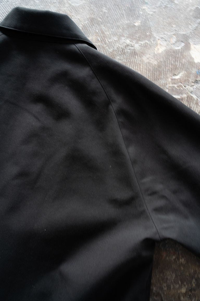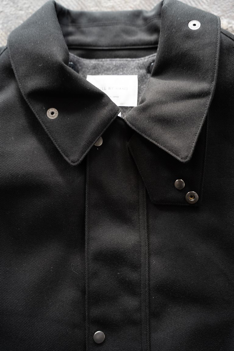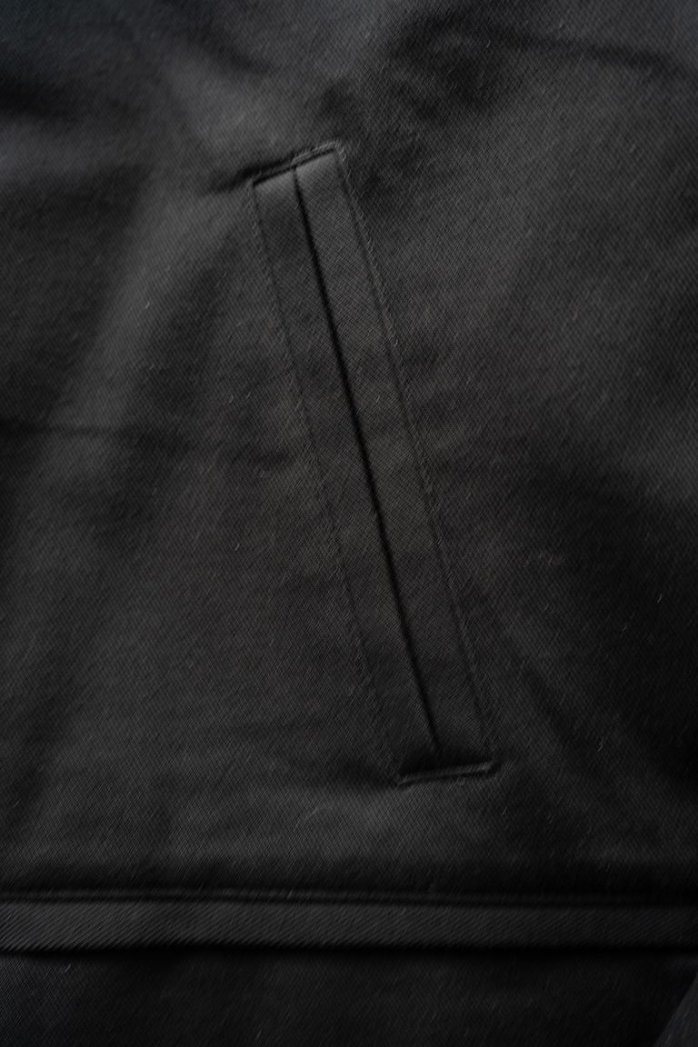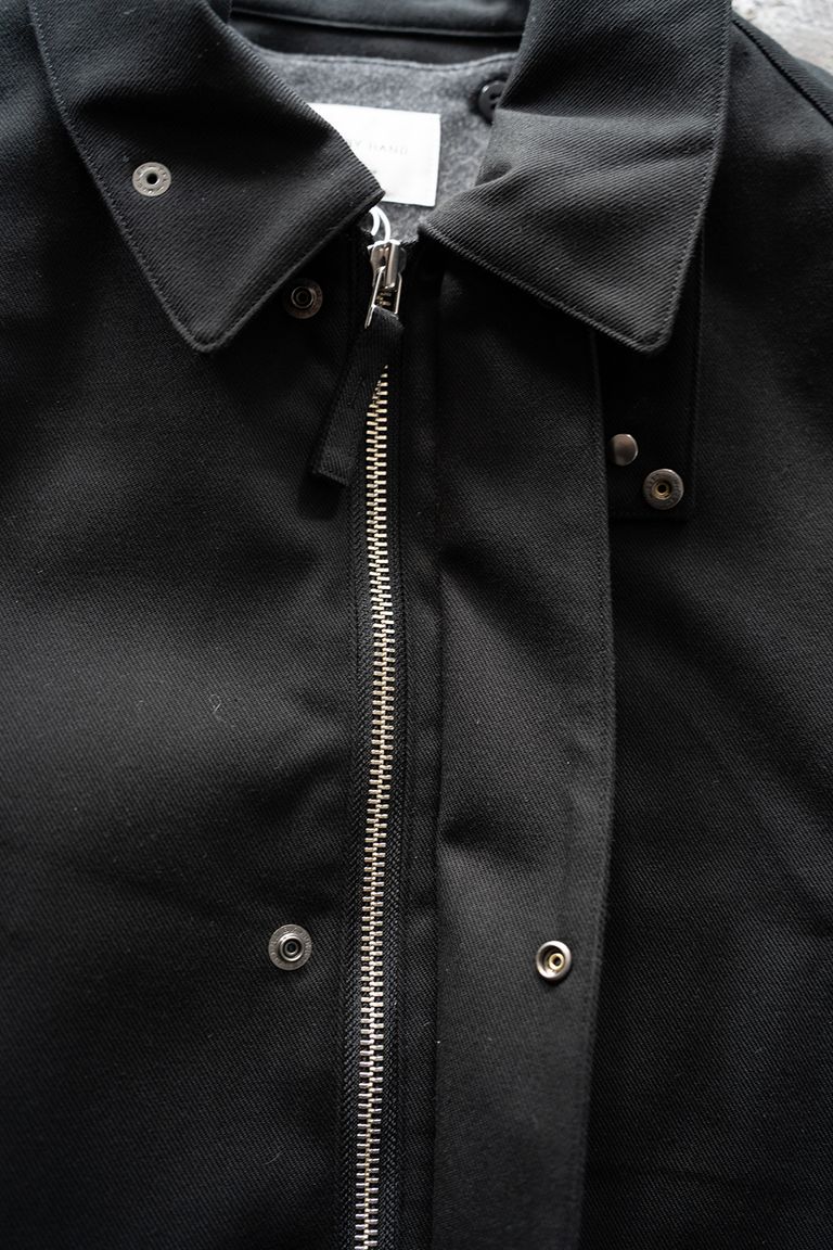 襟元のチンストラップや胸元のハンドウォームポケットは、英国老舗ハンティングジャケットを想起させるデザインでありながら、全体を一色でまとめ、前述した細やかな綾目が美しい品のあるツイル生地を採用することでハンティングジャケットらしい無骨なイメージを無くし、ミニマルで都会的な印象に仕上げております。