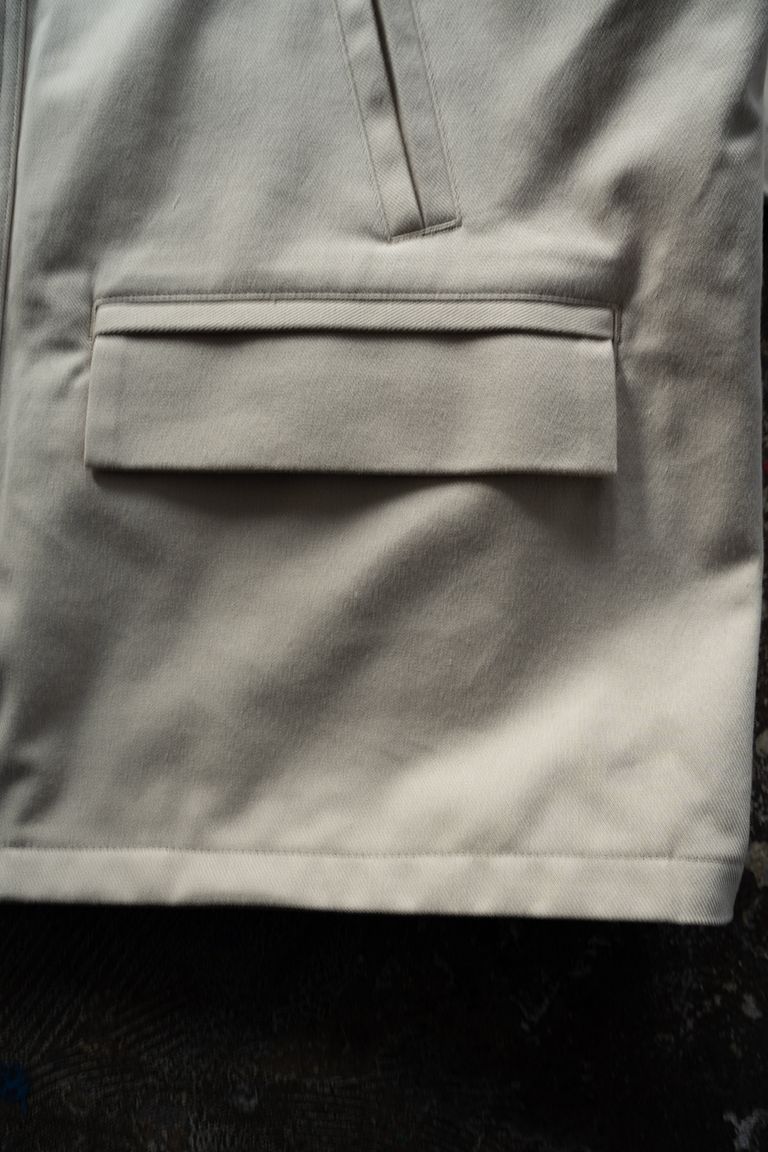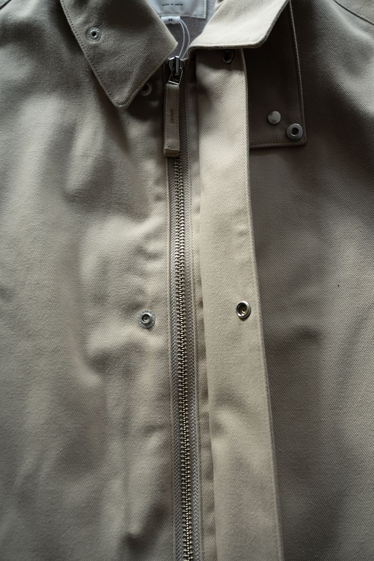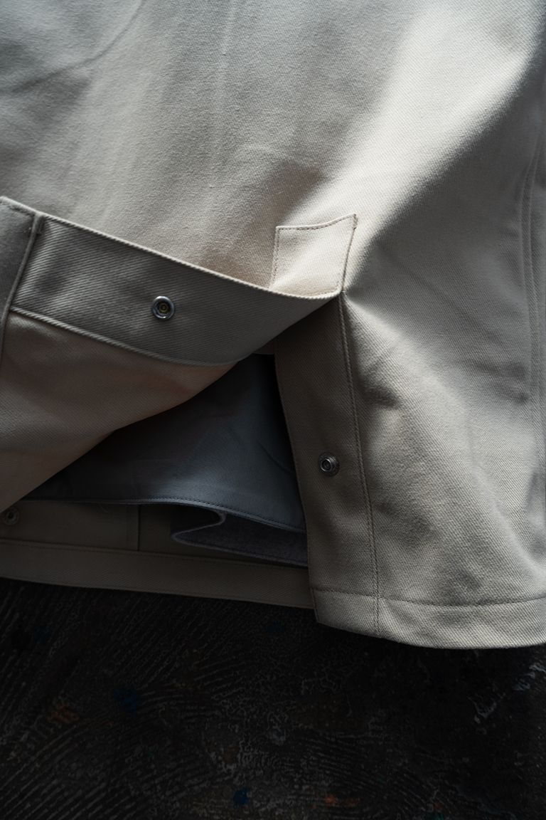 襟元のチンストラップや胸元のハンドウォームポケットは、英国老舗ハンティングジャケットを想起させるデザインでありながら、全体を一色でまとめ、前述した細やかな綾目が美しい品のあるツイル生地を採用することでハンティングジャケットらしい無骨なイメージを無くし、ミニマルで都会的な印象に仕上げております。