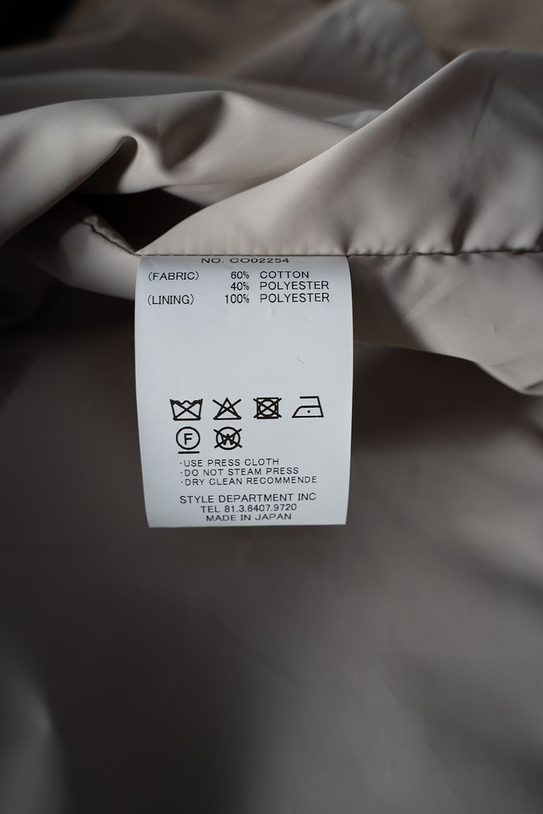 表地:綿60% ポリエステル40% 裏地:ポリエステル100% ライナー表地:ポリエステル80% レーヨン10% アクリル10% ライナー裏地:ポリエステル65% 綿35%