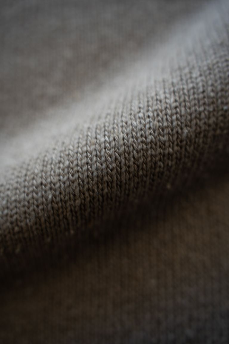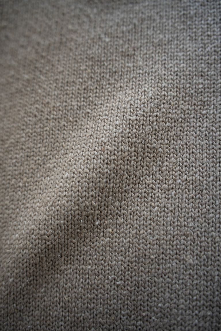 こちらの作品では、太番手でネップの多いシルク100%の糸と綿糸を7Gでプレーティング編みした生地を使用しております。