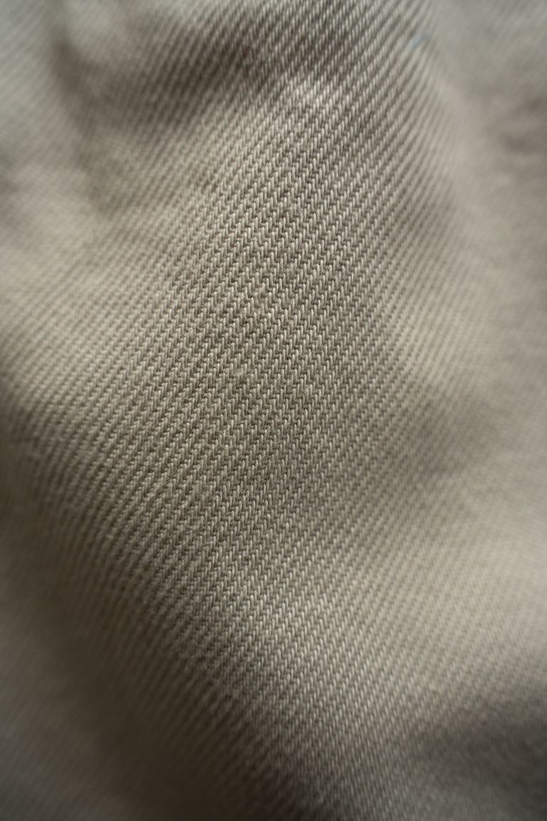 太番手の綿糸を甘めに織り上げることで、厚みがありつつも柔らかくしなやかな質感を得ており、裾に向かってすとんと落ちてゆく、綺麗な落ち感のある生地です。