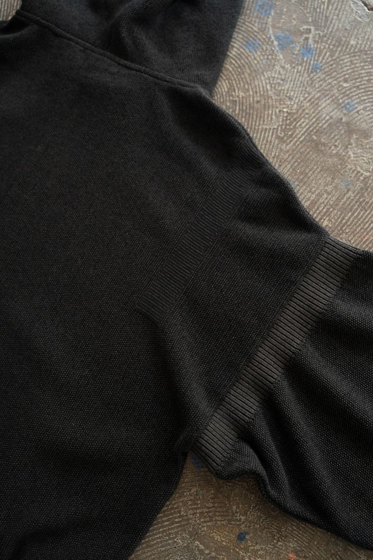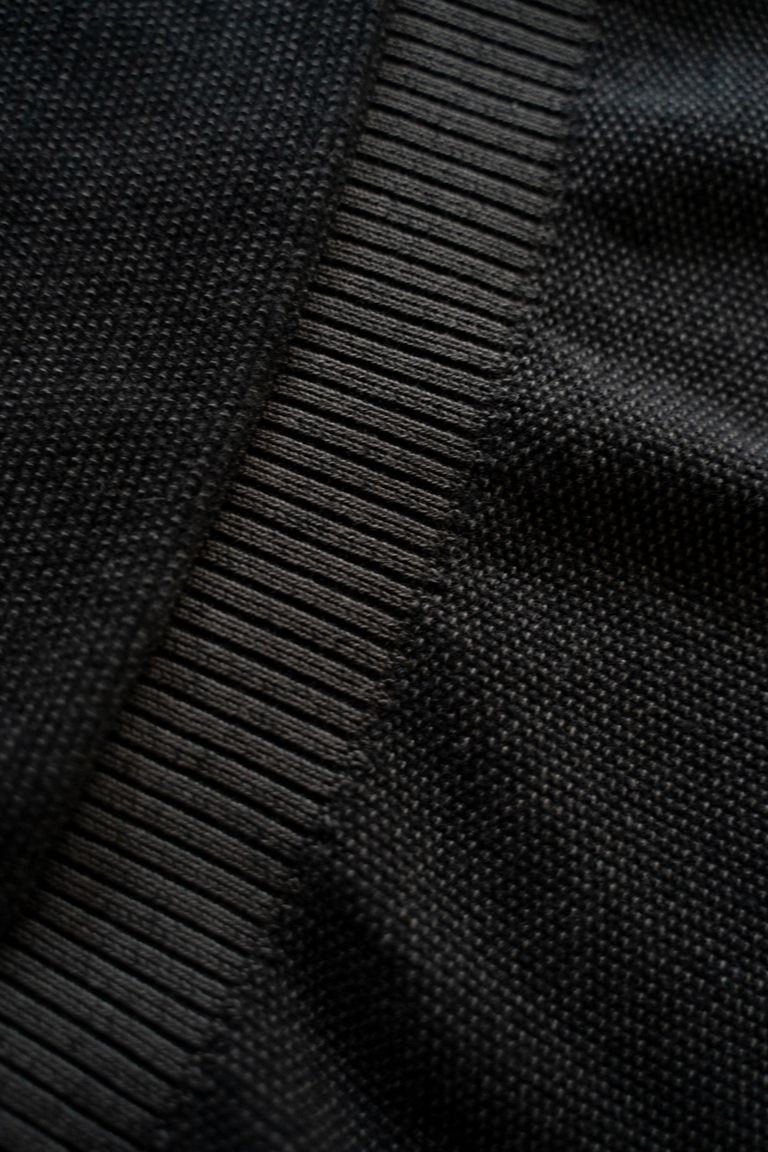 こちらの作品で使用している生地は、12ゲージの編み機に40番手双糸を4本取りして編み立てております。12ゲージの編み機に40番双糸をかけるとなると、通常であれば2本の糸で編み立てるところですので、こちらの生地では2倍の糸を使用していることになります。その分密度が高くなり、軟弱では無く、ギュッと詰まった生地が出来上がります。