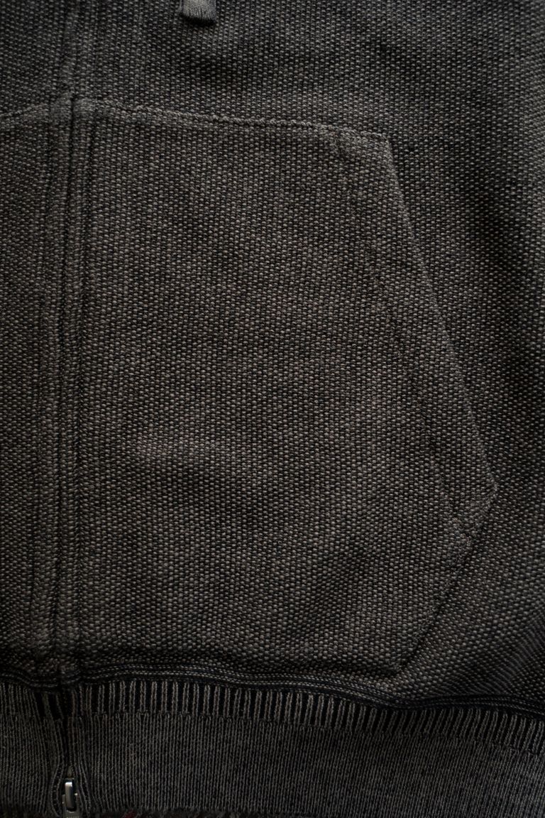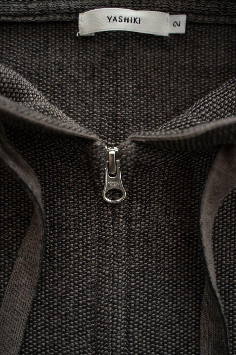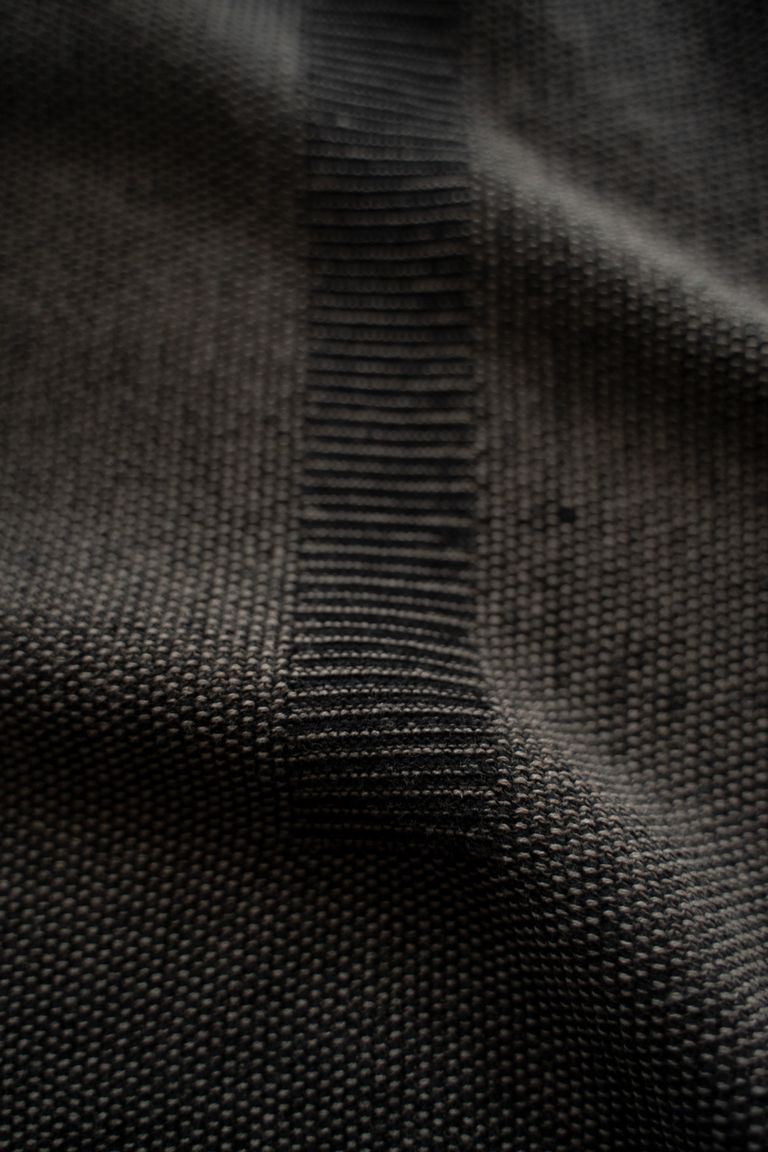 こちらの作品で使用している生地は、12ゲージの編み機に40番手双糸を4本取りして編み立てております。12ゲージの編み機に40番双糸をかけるとなると、通常であれば2本の糸で編み立てるところですので、こちらの生地では2倍の糸を使用していることになります。その分密度が高くなり、軟弱では無く、ギュッと詰まった生地が出来上がります。