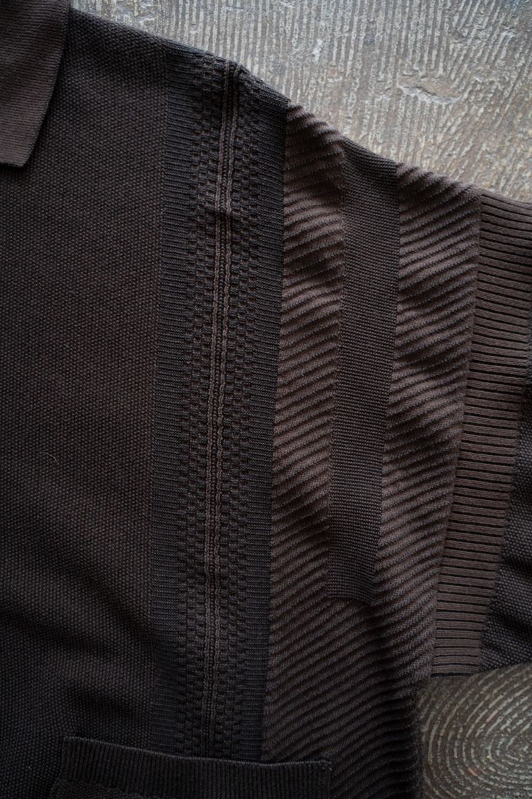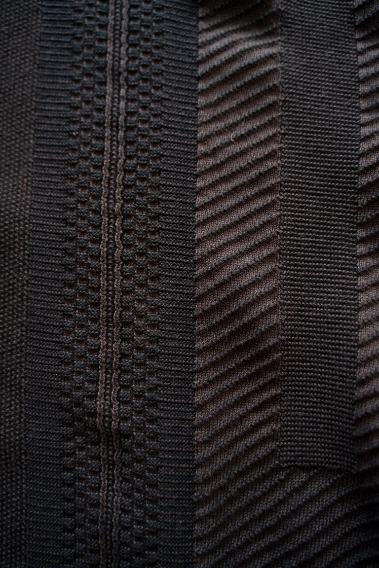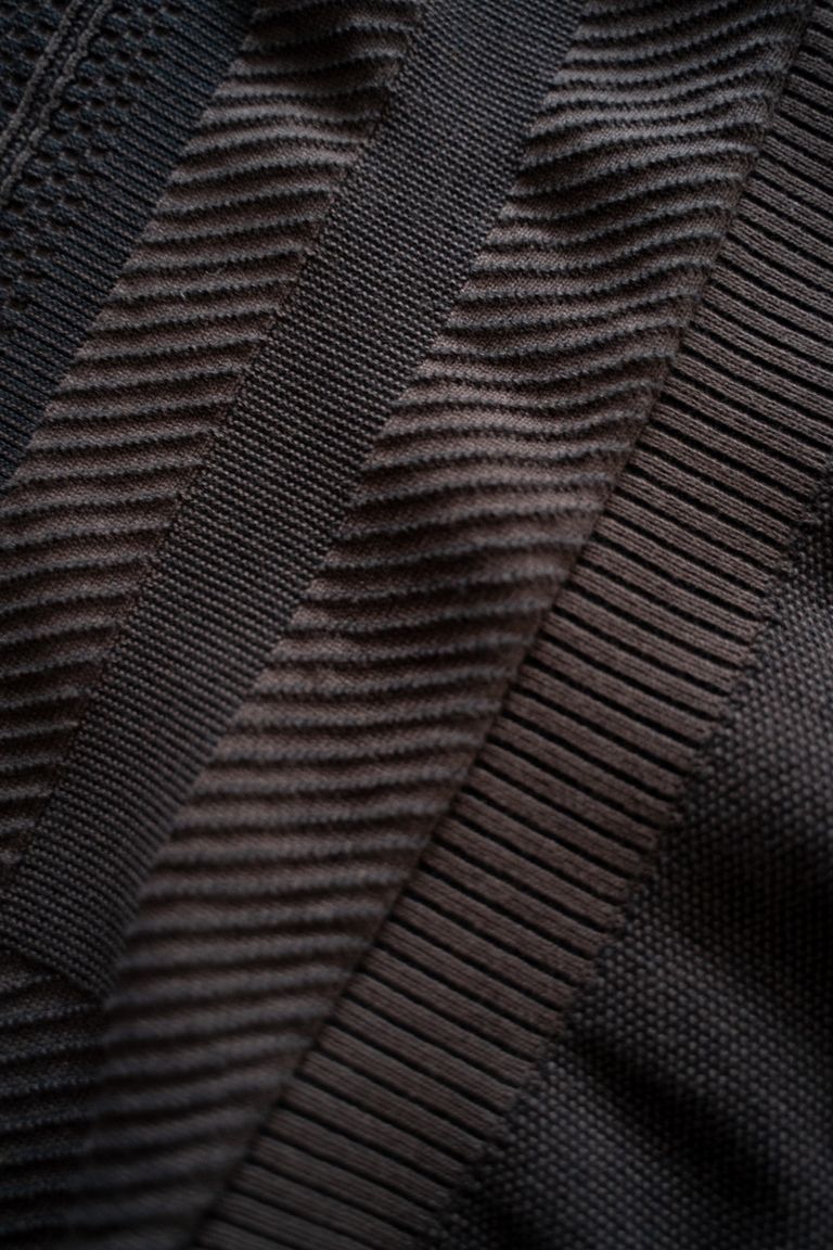 こちらの作品では、40番手の綿糸を二本撚り合わせ、その糸を三本取り12ゲージの編み機に掛けて編み立てております。通常の二倍近くの本数を使用しておりますので、しっかりと目が詰まった編み地です。