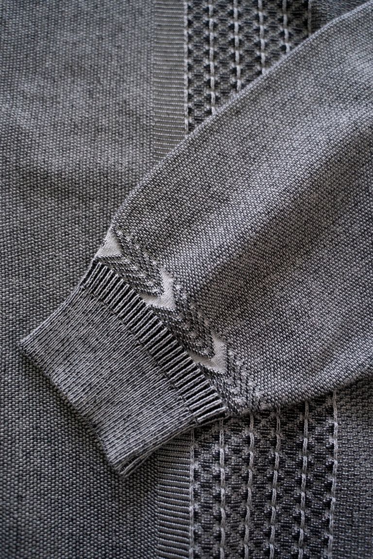 こちらの作品で使用している生地は、12ゲージの編み機に40番手双糸を3本取りして編み立てております。