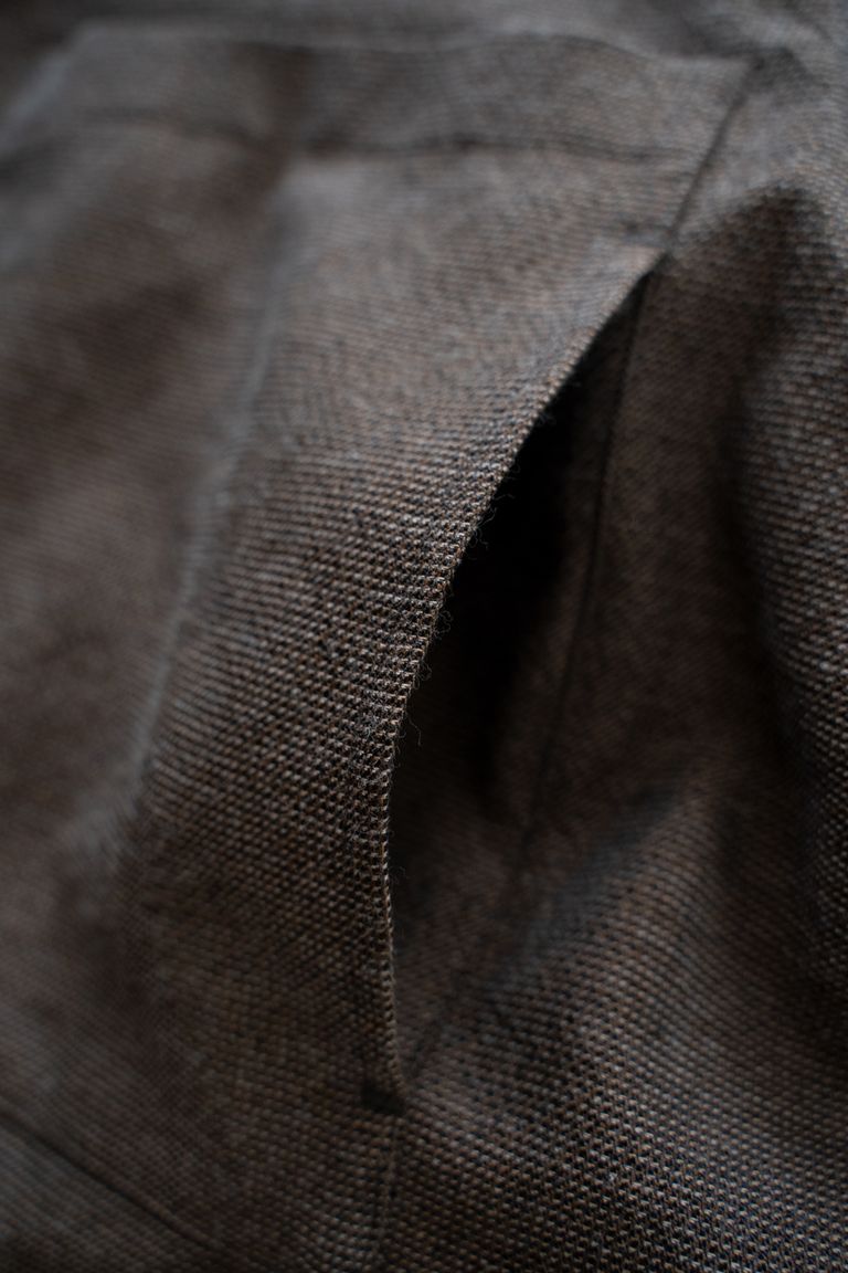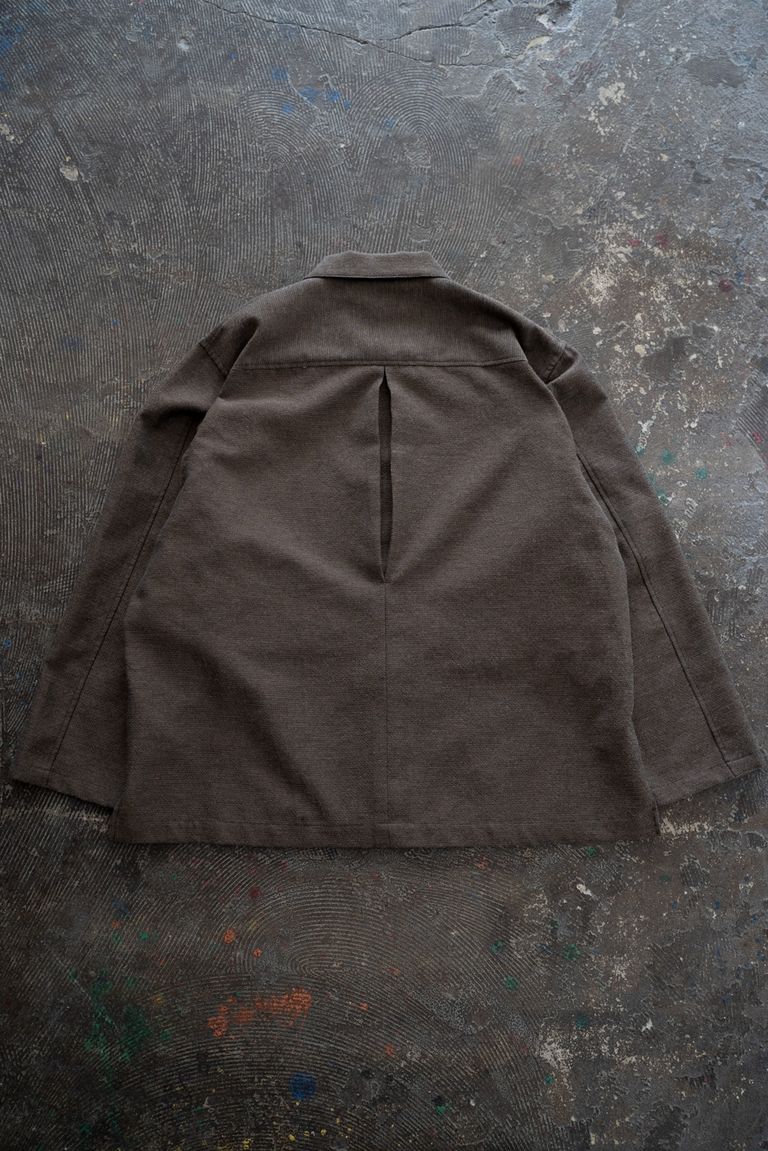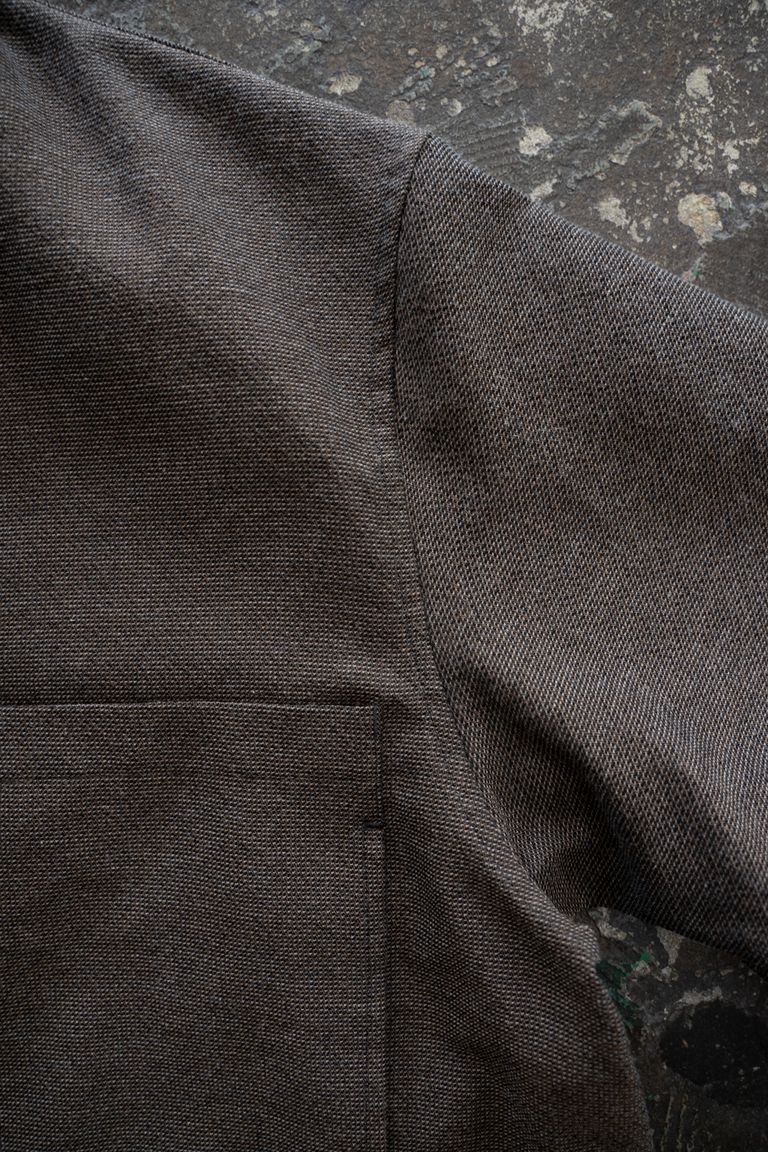 前述した適度な厚みのある生地を使用しながらも、裏地をつけないことで、シャツとしてもジャケットとしても着用できる汎用性の高い作品です。