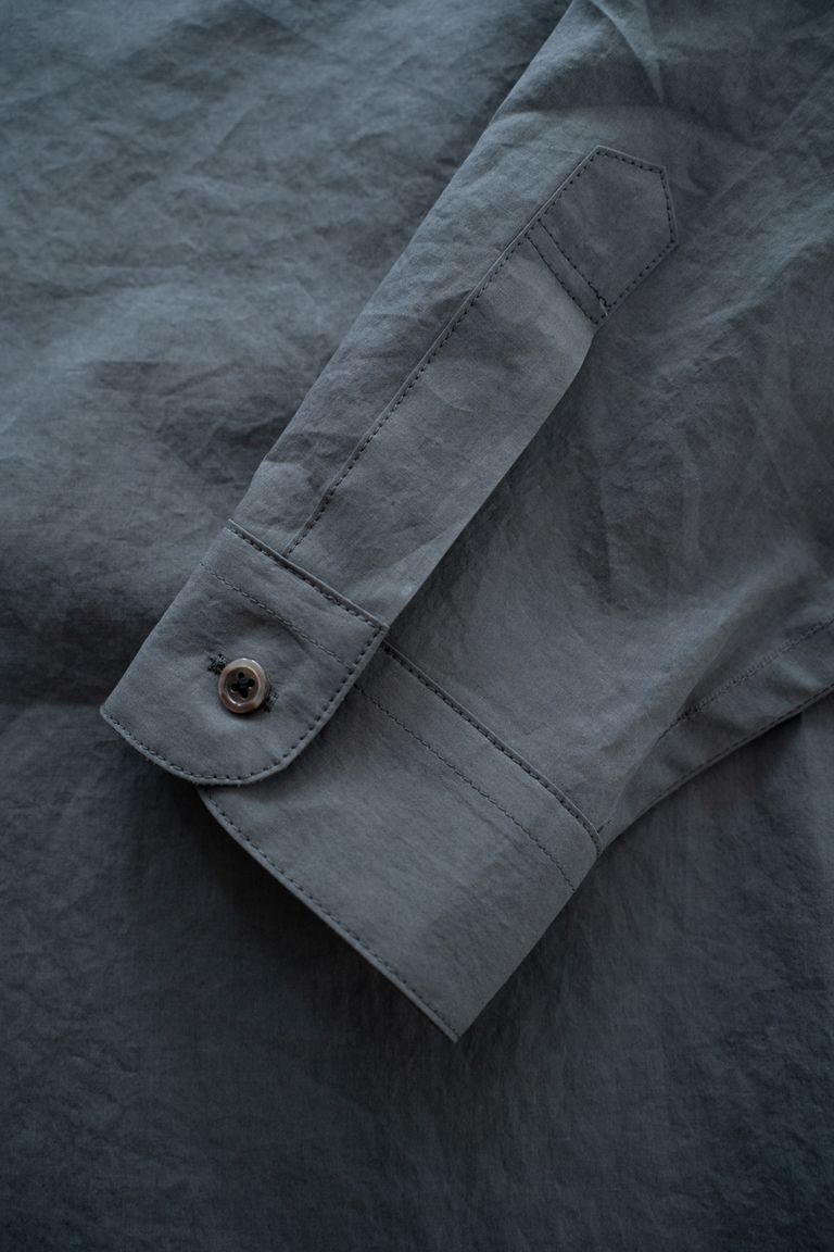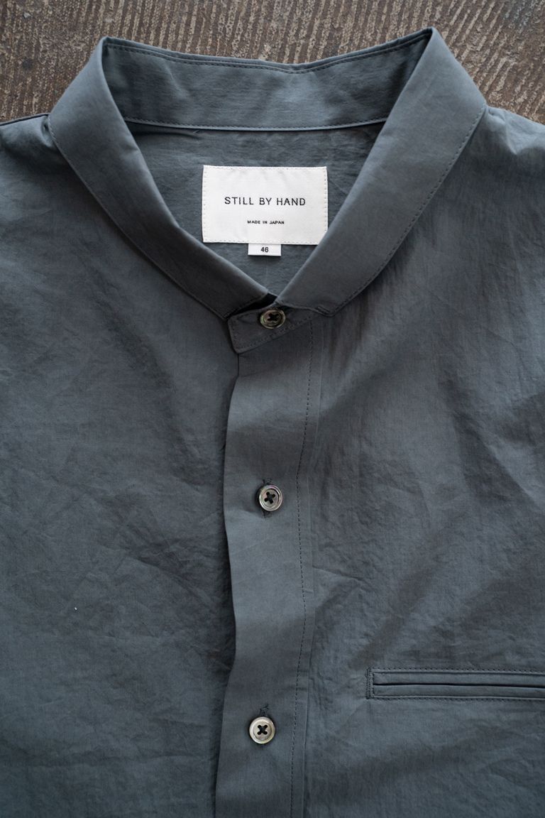 一見するとバンドカラーですが、こちらは極小の襟の先をカンヌキ止めした仕様となっており、STILL BY HANDらしい遊び心を感じるデザインです。