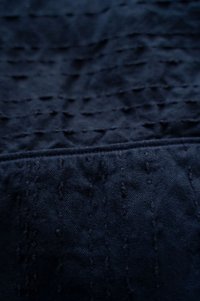 (※)刺し子…日本に古くから伝わる針仕事の技法。布を重ねて縫い合わせることで生地の強度や保温性を高める目的で用いられていた。縫い目が連続することで生まれる格子柄や幾何学的な模様は、装飾としても取り入れられ、現在では日本の伝統的なテキスタイル表現として親しまれている。