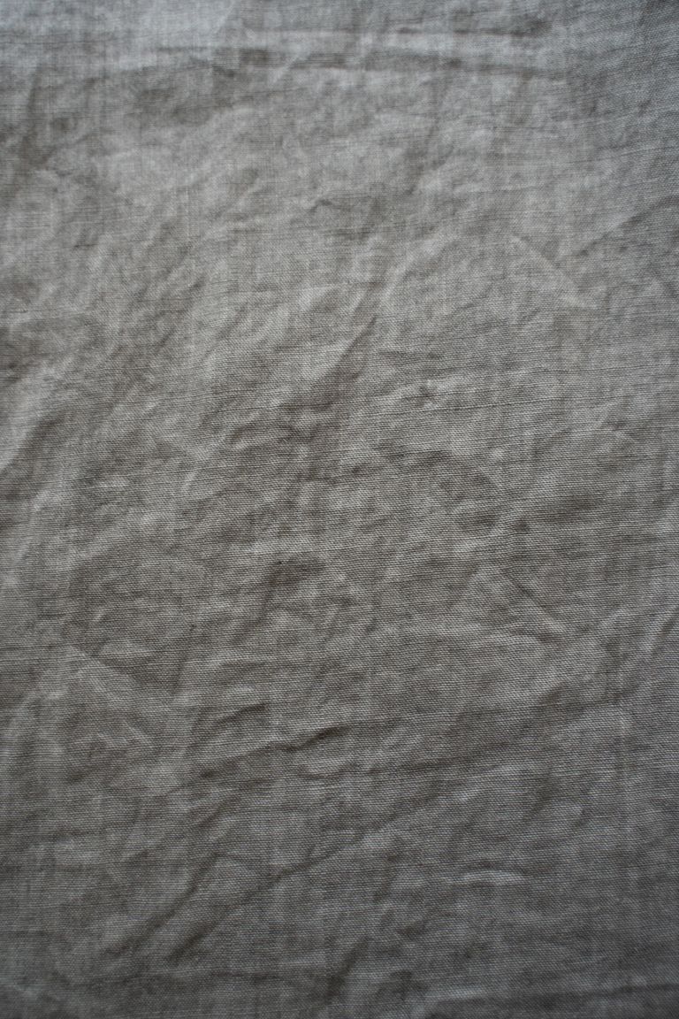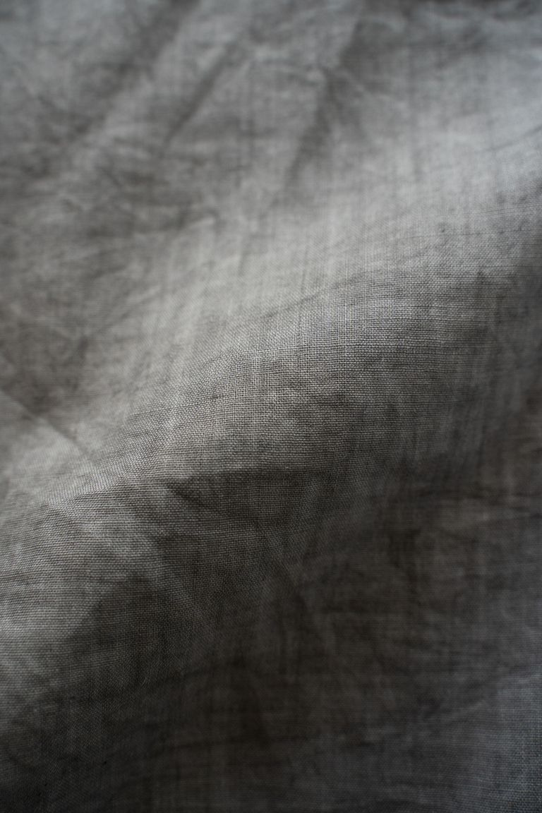 こちらのカラーでは、奈良県産の松の木の煤を天然ゴムを用いて定着させております。不規則な濃淡が細かなグラデーションの様に入り、プツプツと点状の着色が重なった、奥行きのある色です。着用を重ねる程に淡くフェードしてゆきます。色合いの美しい変化の工程をお愉しみ下さいませ。