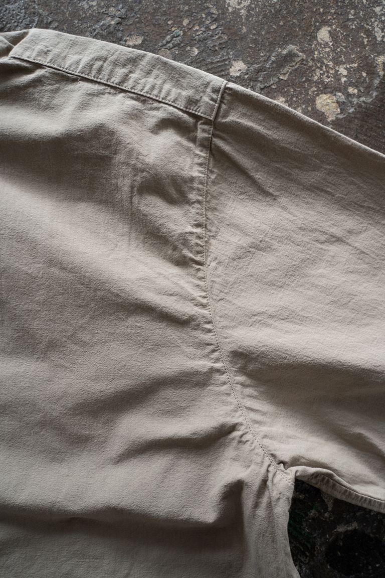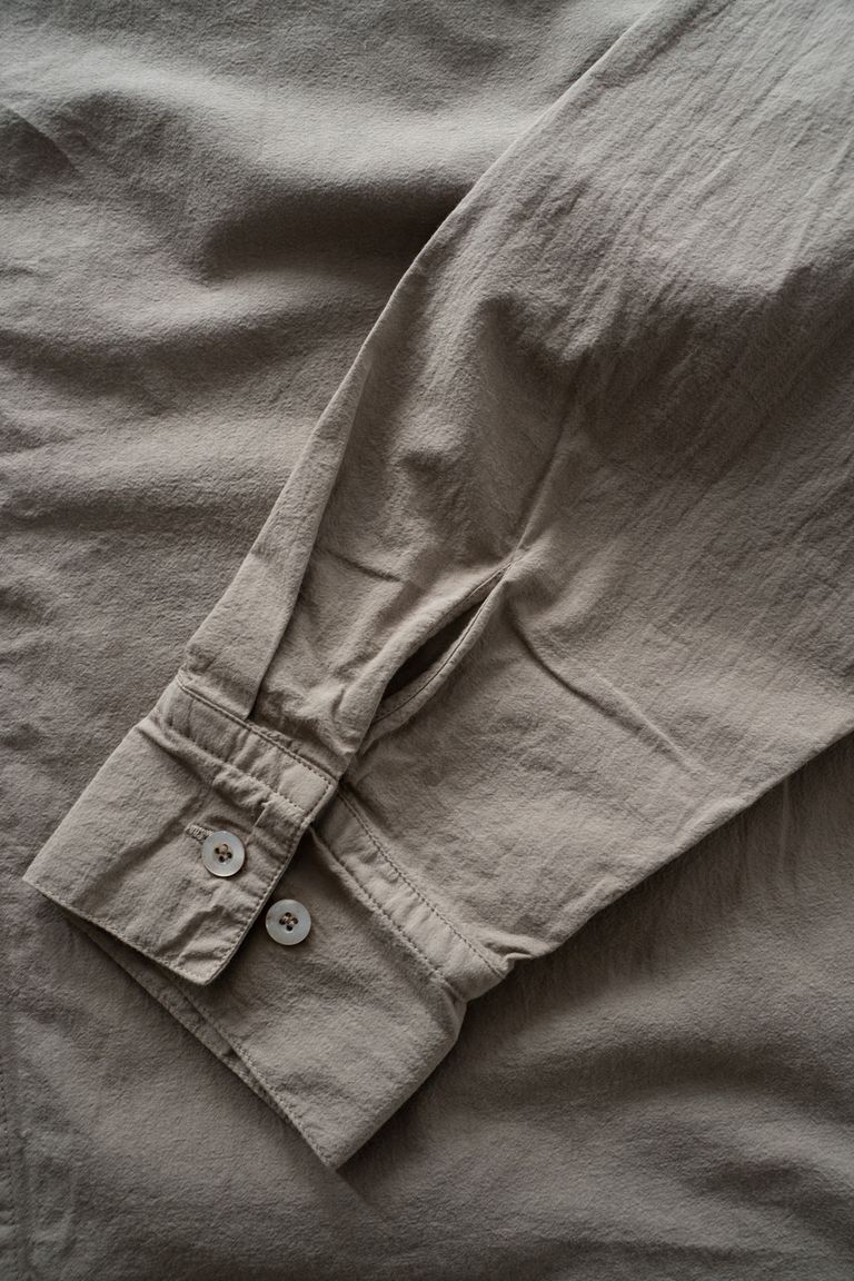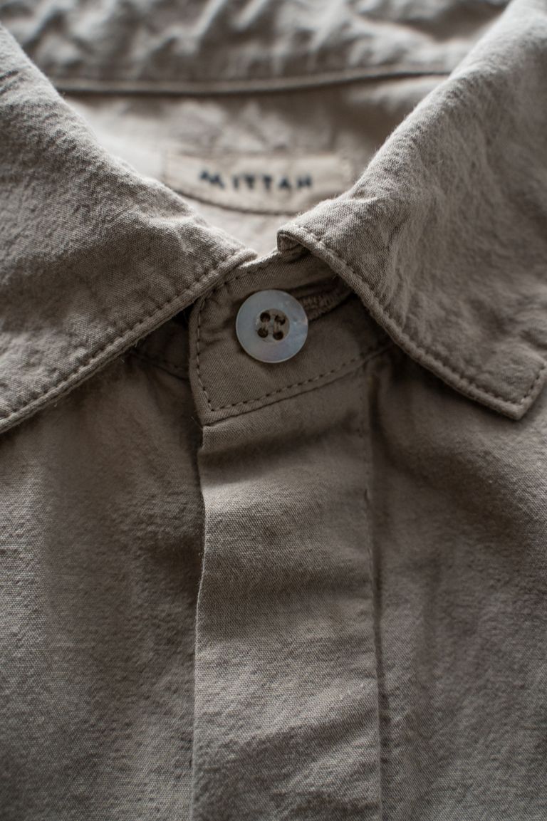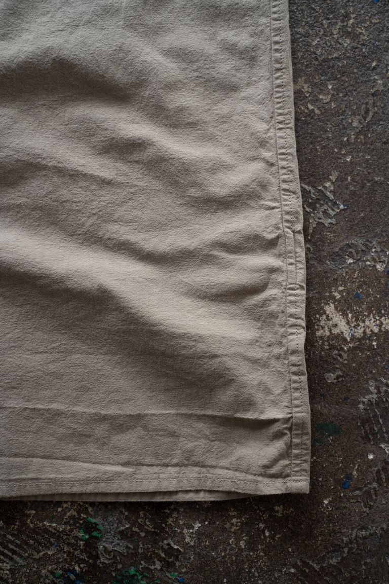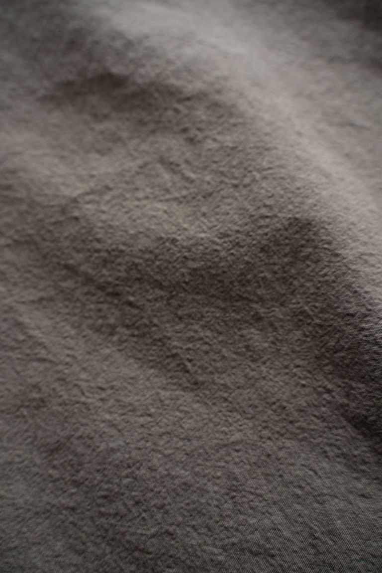 こちらのカラーでは、珈琲を用いて染色しております。色の濃淡やムラが出やすく、着用と洗いを重ねることで淡くなってゆく色合いの変化をお愉しみいただけます。