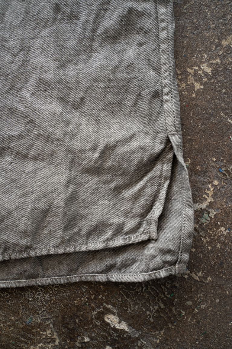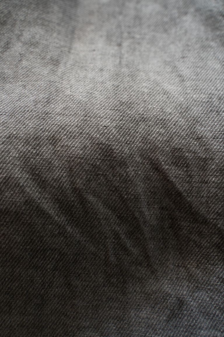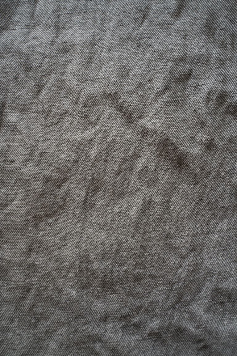 こちらのカラーでは、奈良県産の松の木の煤を天然ゴムを用いて定着させております。不規則な濃淡が細かなグラデーションの様に入り、プツプツと点状の着色が重なった、奥行きのある色です。着用を重ねる程に淡くフェードしてゆきます。色合いの美しい変化の工程をお愉しみ下さいませ。