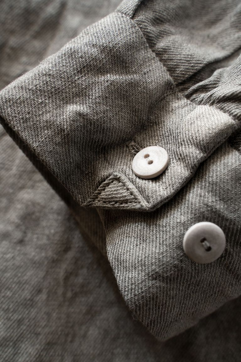 また、ボタンには綿素材を圧縮したものを用いており、製品染めによりボタンも同色に染まってそれぞれの個性のある仕上がりとなっております。ボタンは全て手付けし、全てしっかりと根巻きされており、どこまでも丁寧な印象が伝わります。