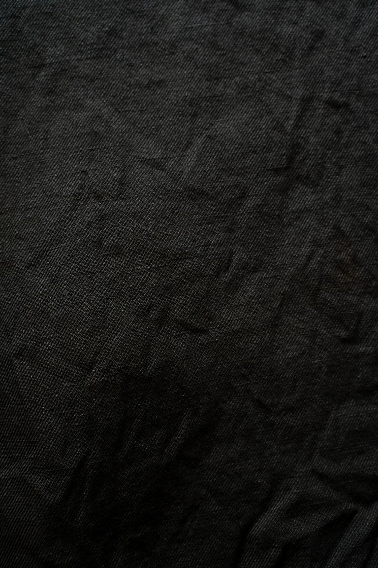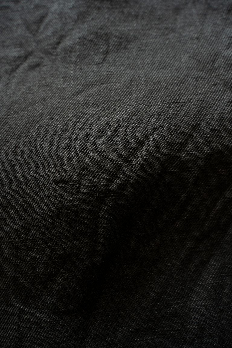 こちらのカラーでは柿渋染めと墨染めを施しております。柿渋特有の赤褐色に墨の深みのある黒が重なり、チャコールのようにも見える独特な深みのある色合いに仕上がっております。
