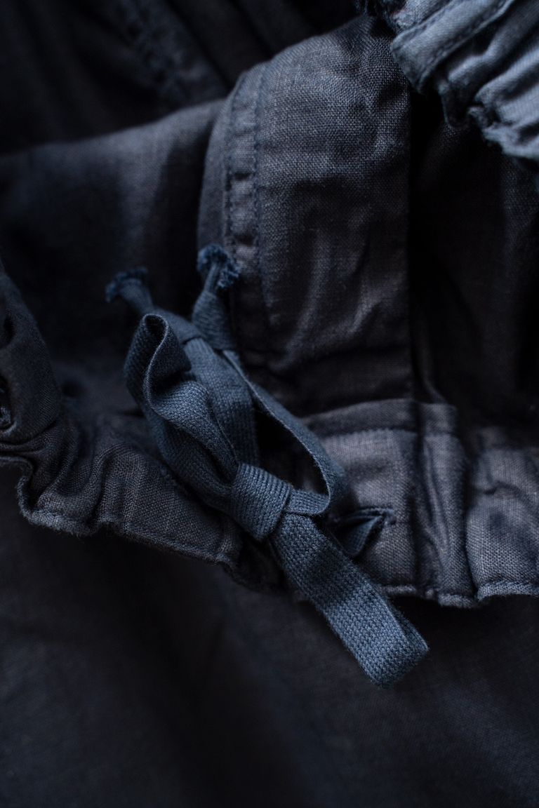 ウエストはゴム+ドローストリングによるイージー仕様です。縫製後に洗い加工している為、一点一点サイズに若干のぶれがあります。