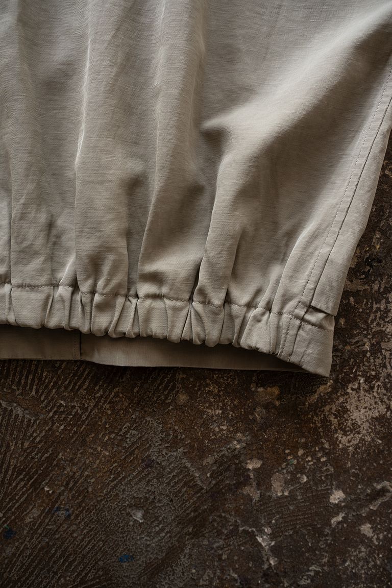 裾の後ろ側にはゴムを配しており、着用した際には丸みのあるフォルムを形成します。前述の滑らかで落ち感のある生地と相まって、背面には美しいドレープが生まれます。