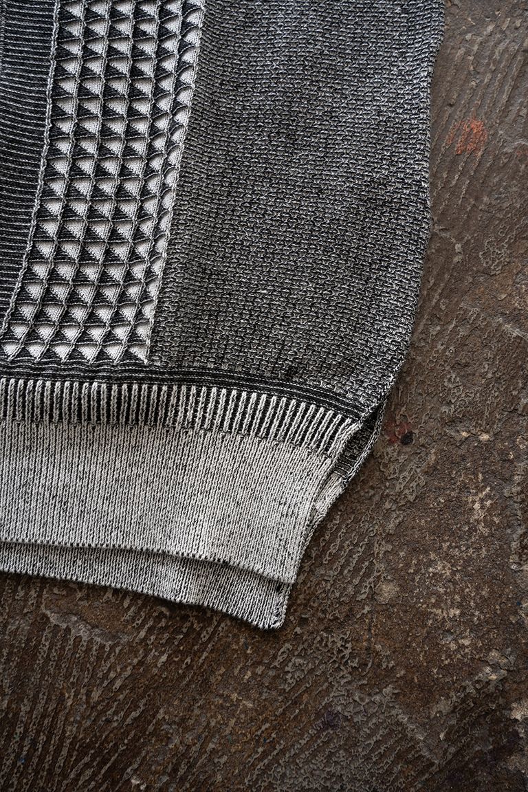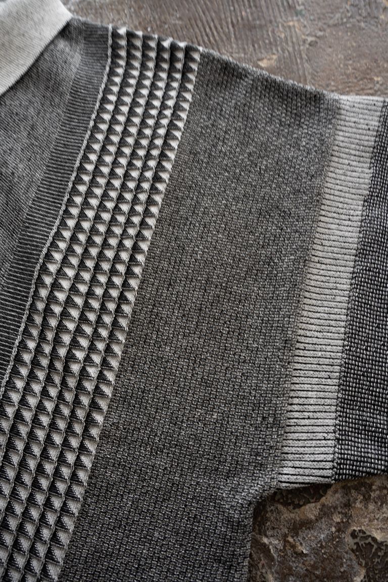 こちらの作品で使用している生地は、12ゲージの編み機に40番手双糸を2本取りして編み立てております。昨年までのものよりも薄く、軽く仕上げておりますので、夏場も涼しく着用が可能です。
