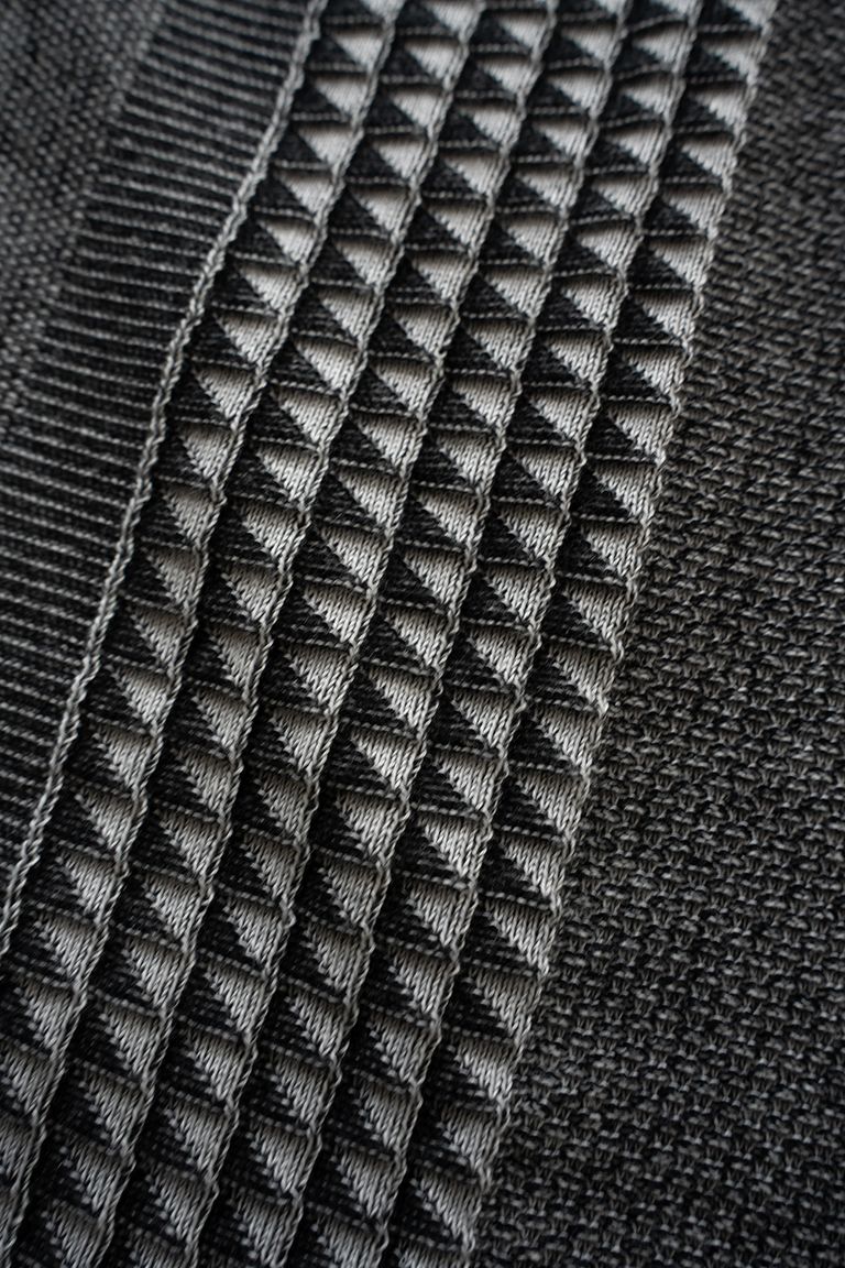 身頃中央と脇の細かな凹凸の大きさの違いでしとしと降る梅雨の雨粒を表し、肩部分から裾に入った三角模様で雨に濡れてしっとりと輝く様子を表現しております。
