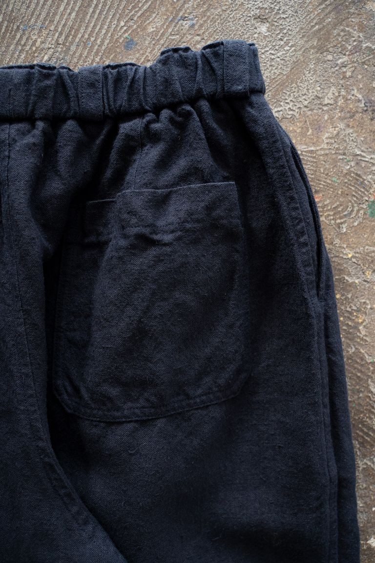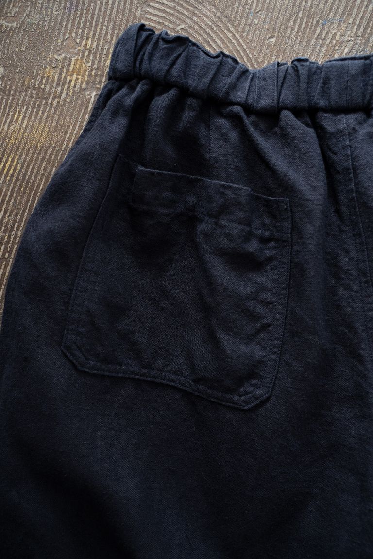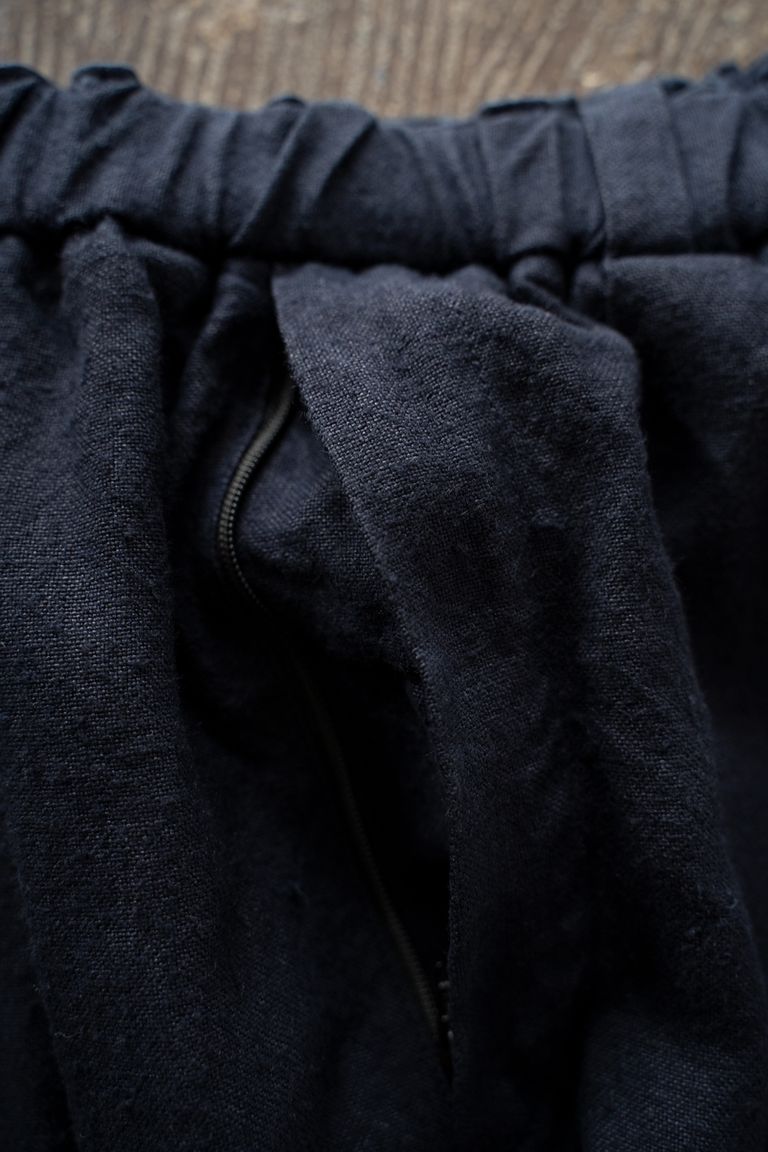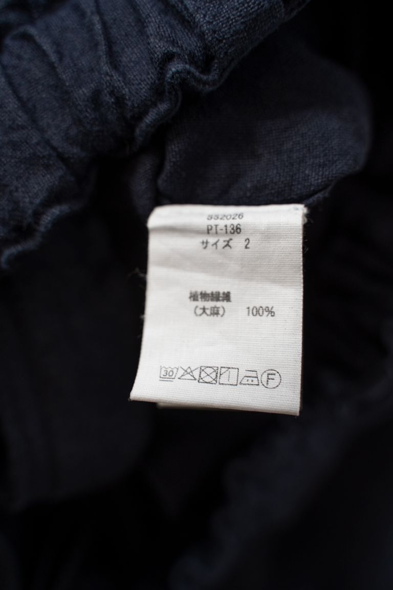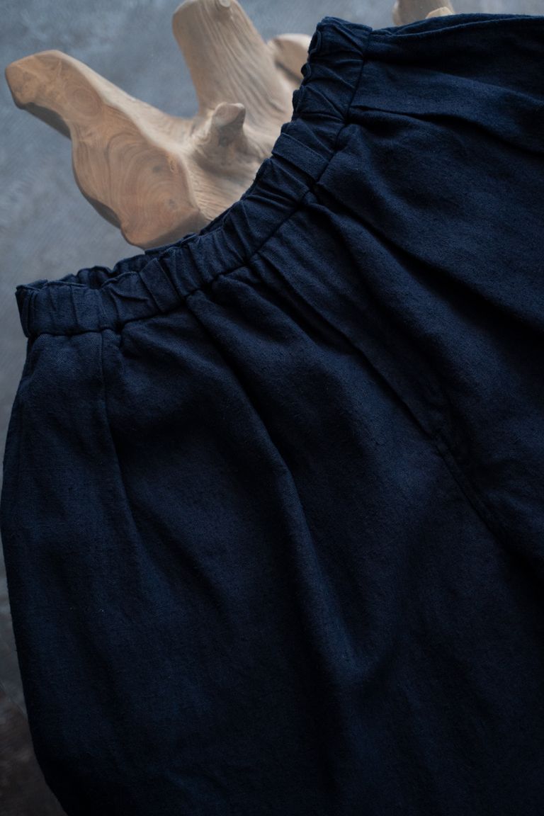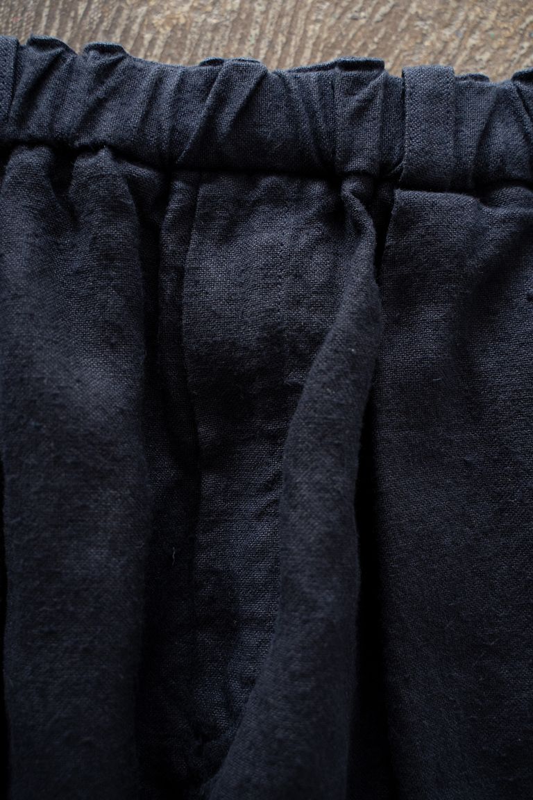 ウエストはゴム+ドローストリングによるイージー仕様です。縫製後に洗い加工している為、一点一点サイズに若干のぶれがあります。