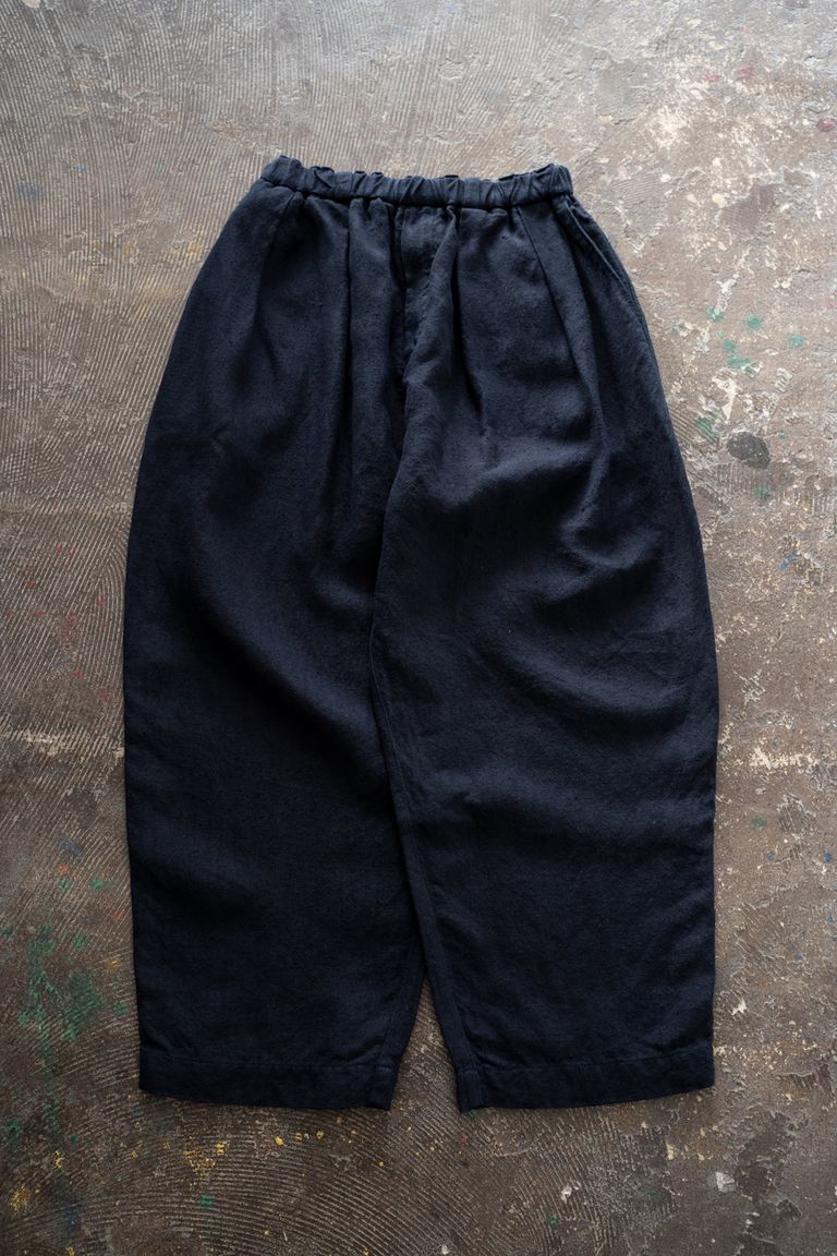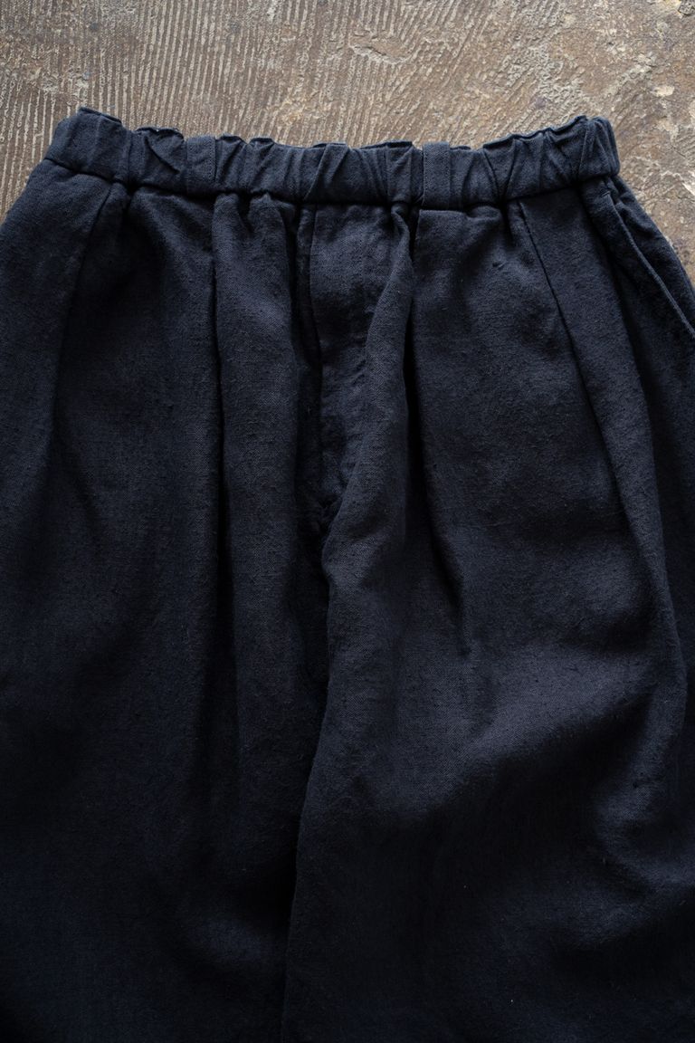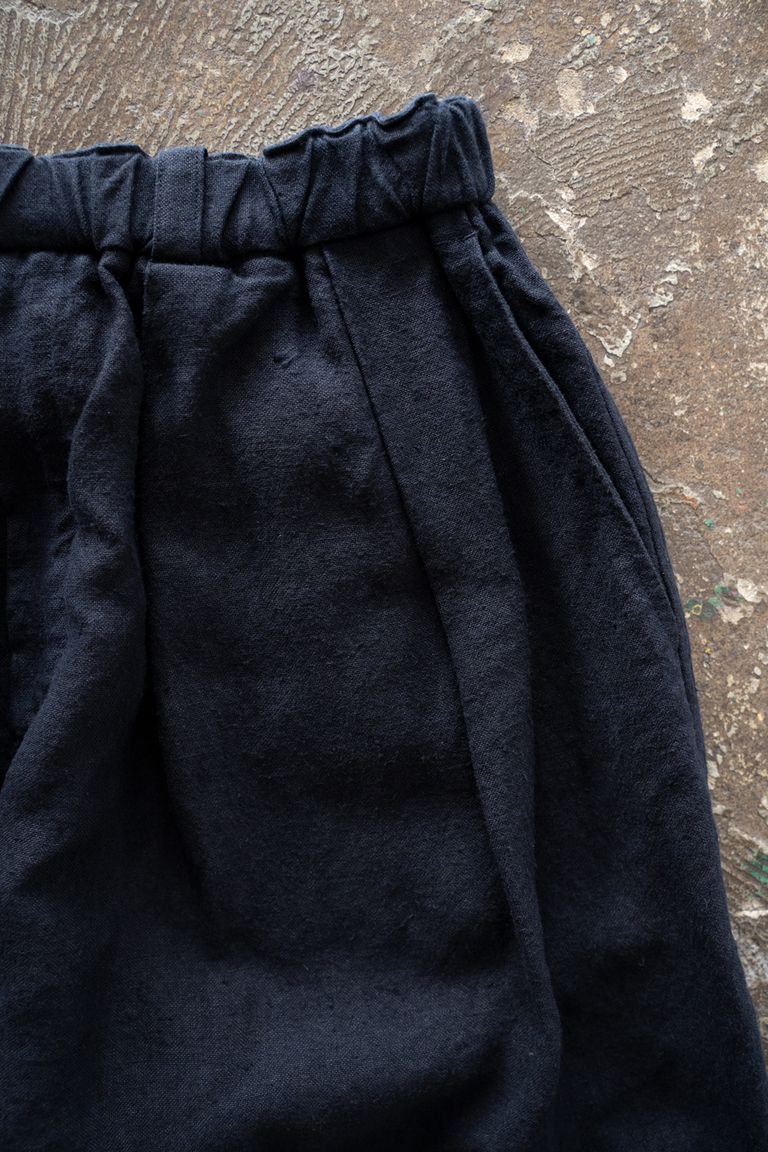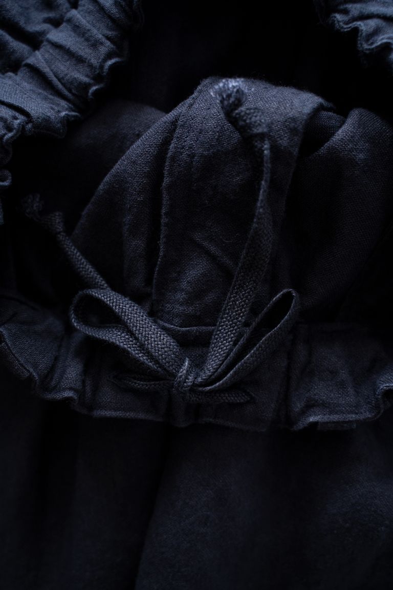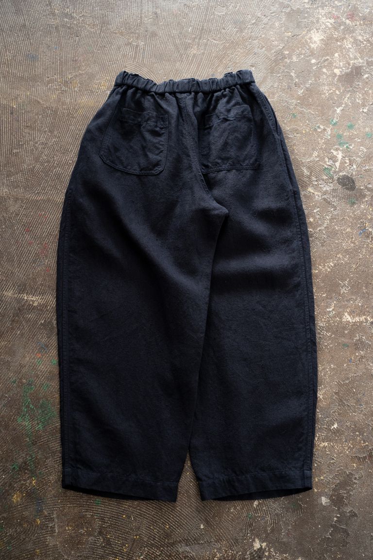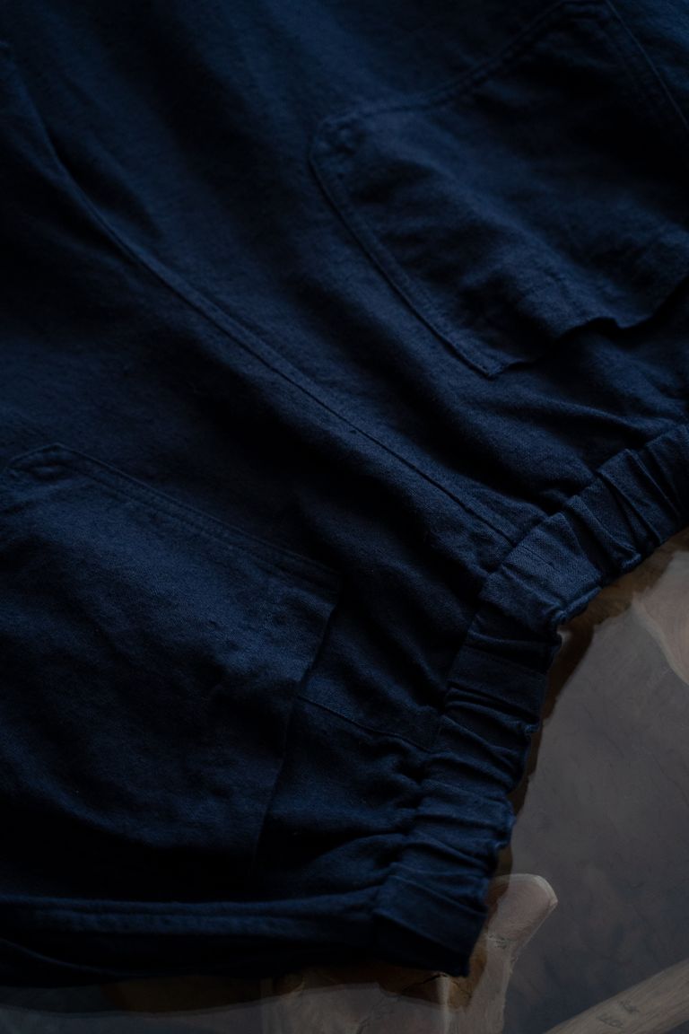 ウエストはゴム+ドローストリングによるイージー仕様です。縫製後に洗い加工している為、一点一点サイズに若干のぶれがあります。