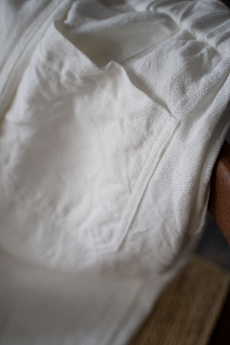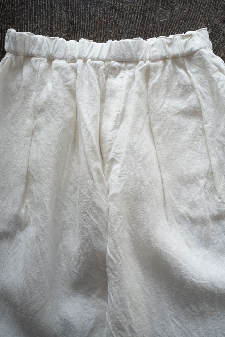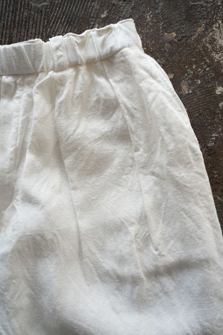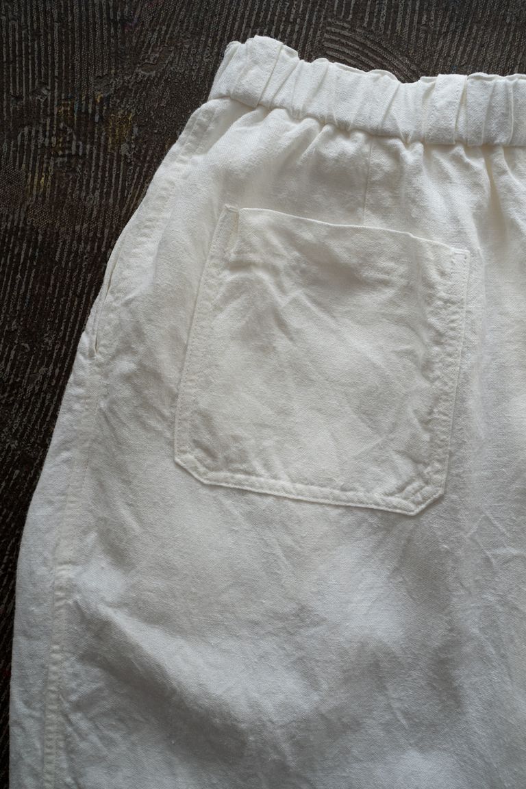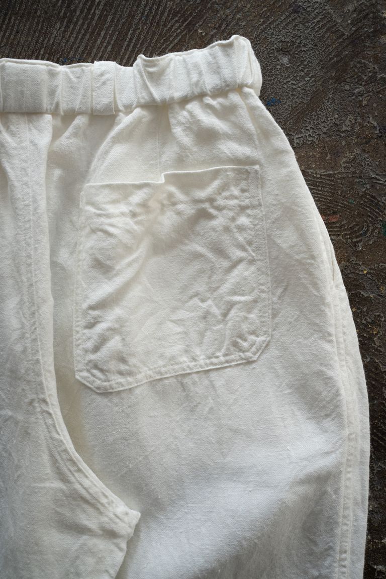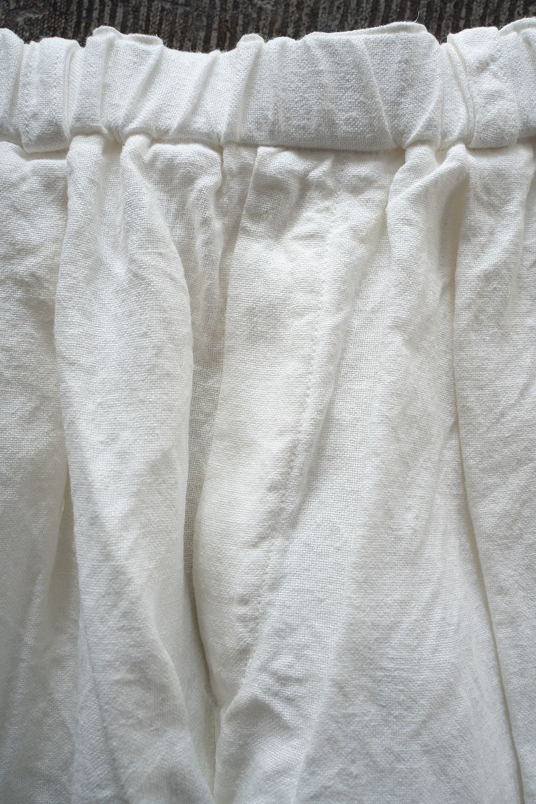 ウエストはゴム+ドローストリングによるイージー仕様です。縫製後に洗い加工している為、一点一点サイズに若干のぶれがあります。