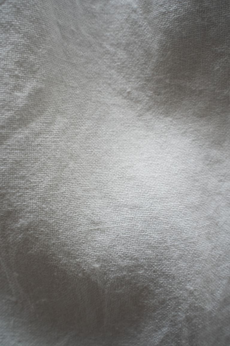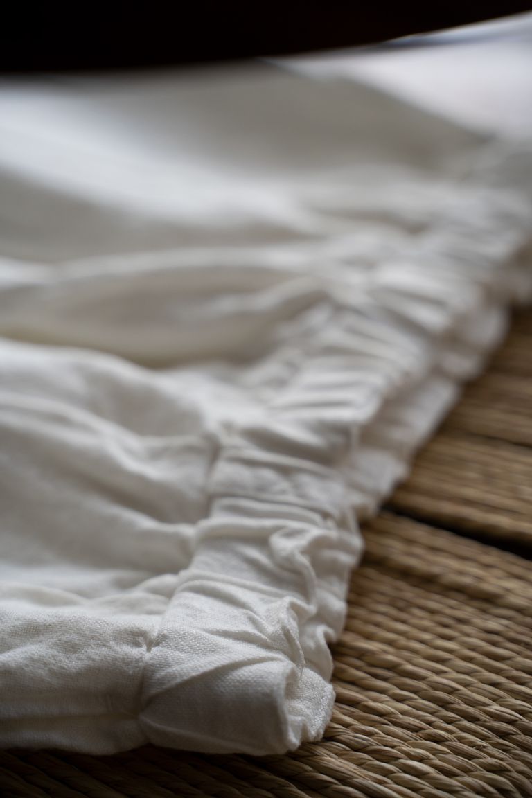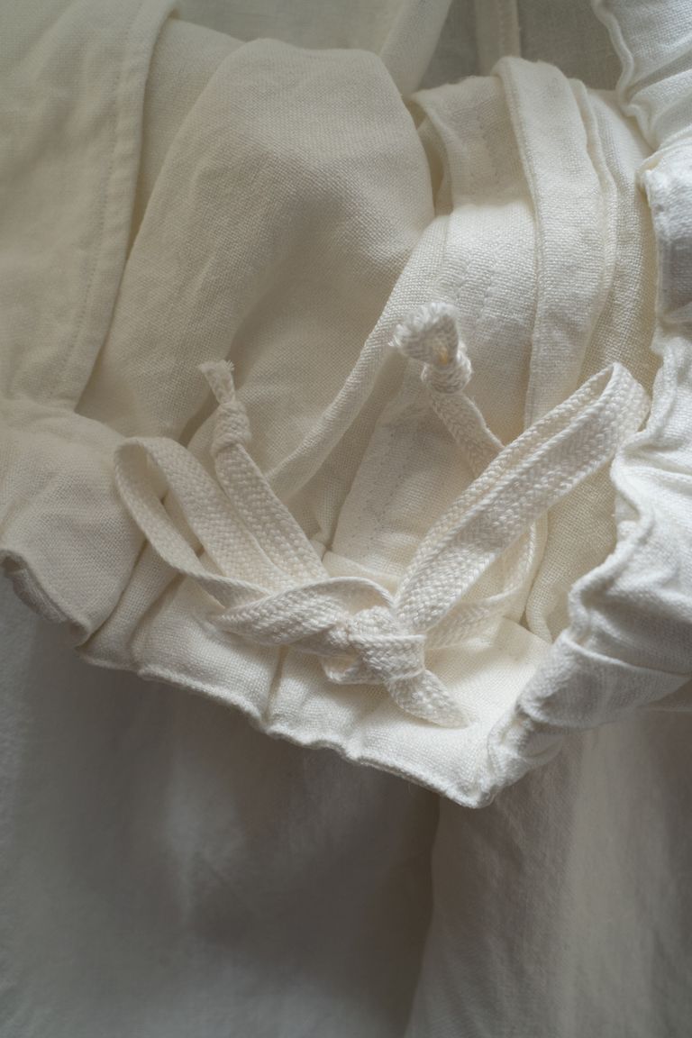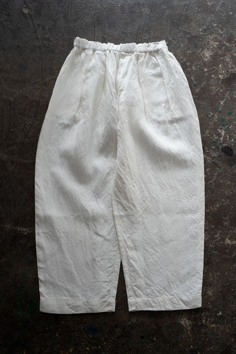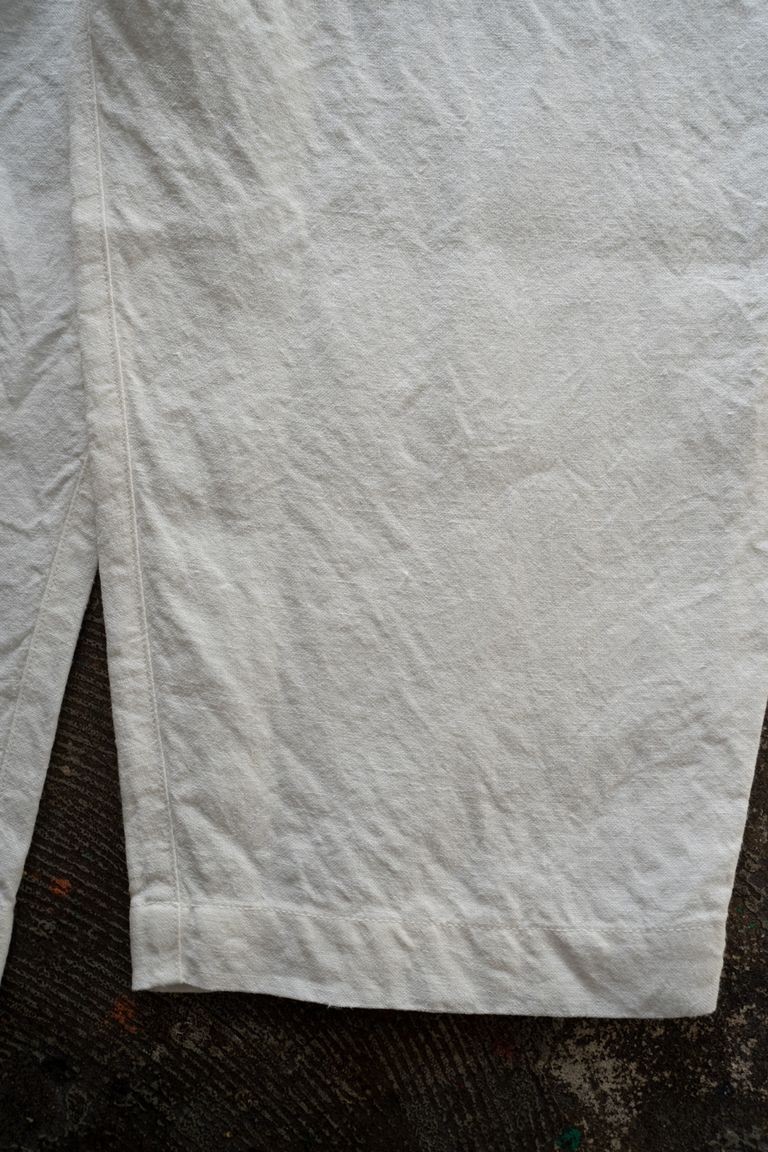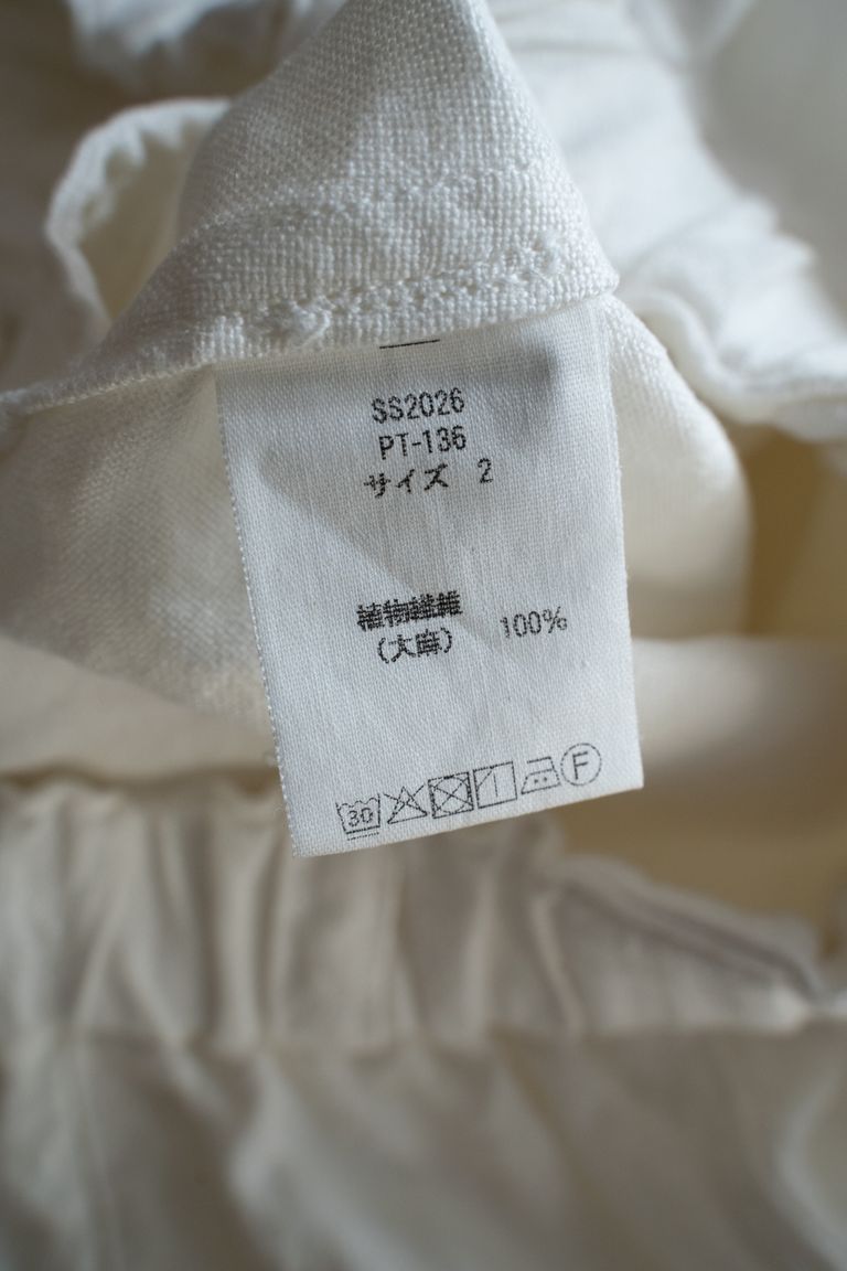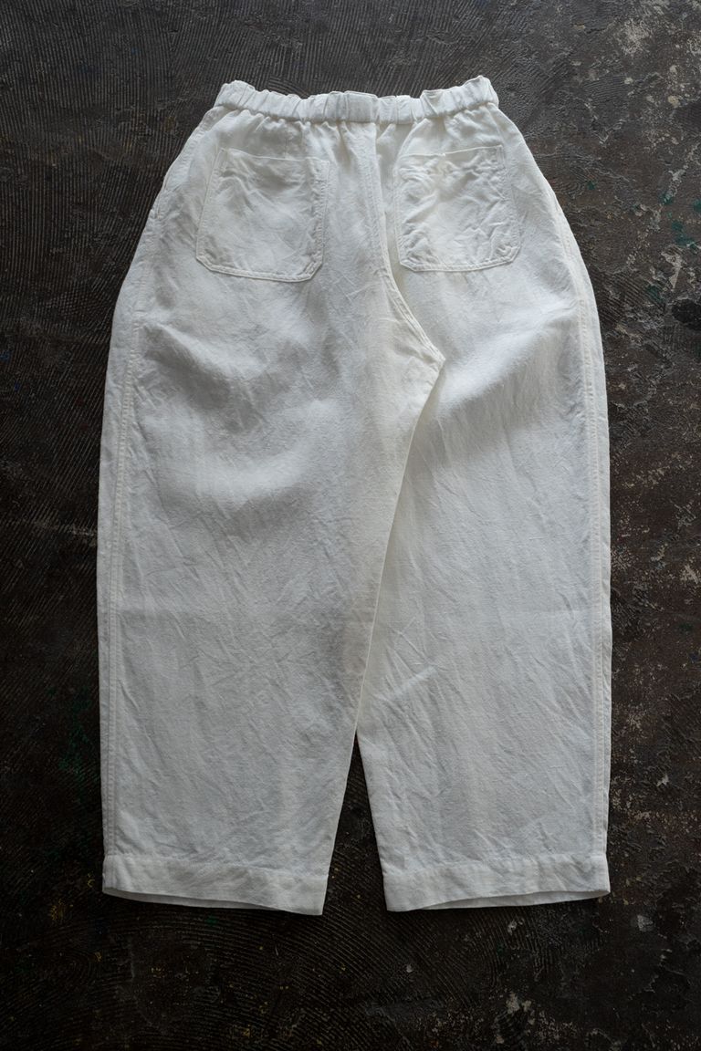 ウエストはゴム+ドローストリングによるイージー仕様です。縫製後に洗い加工している為、一点一点サイズに若干のぶれがあります。