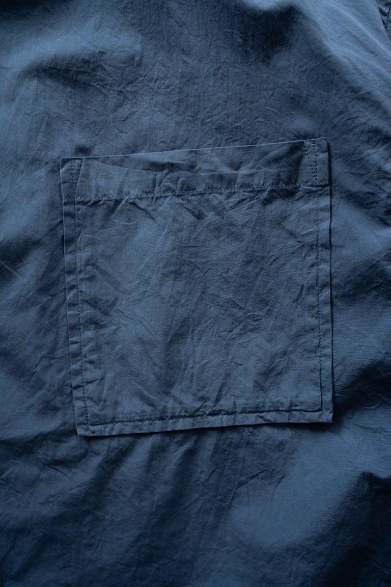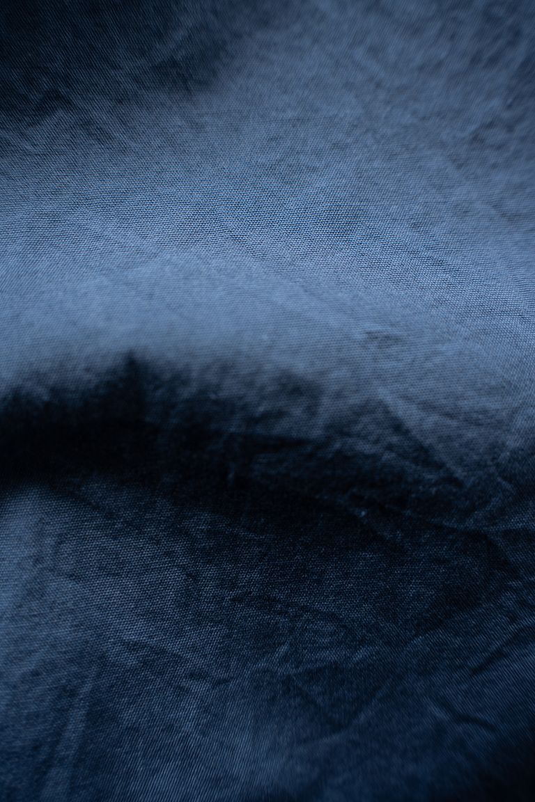 そちらの生地に製品染めを施し柔らかなトーンの色が得られ、シボやパッカリングも生まれたナチュラルな風合いに仕上がっております。