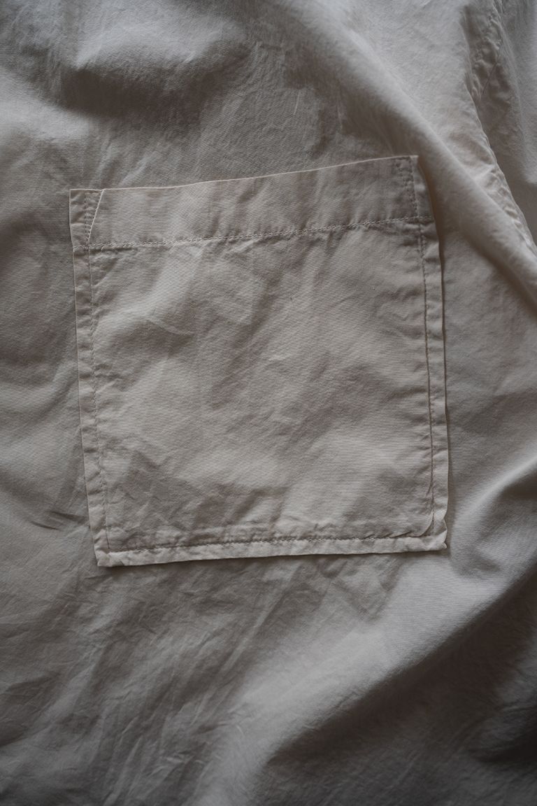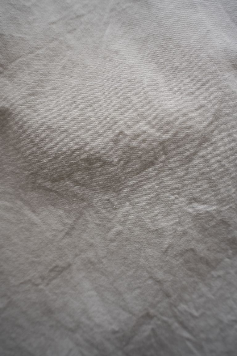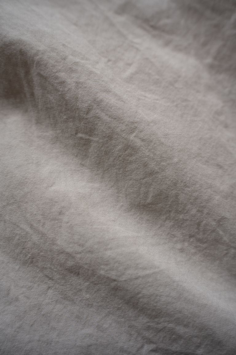 そちらの生地に製品染めを施し柔らかなトーンの色が得られ、シボやパッカリングも生まれたナチュラルな風合いに仕上がっております。