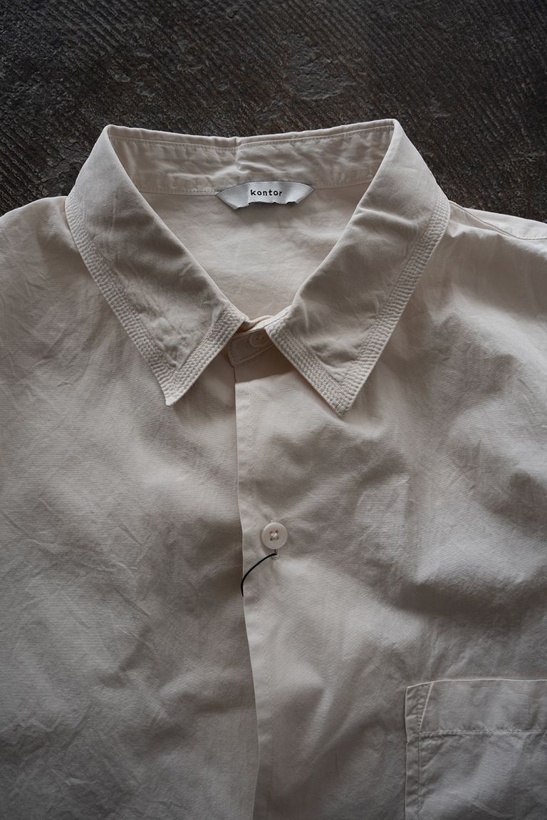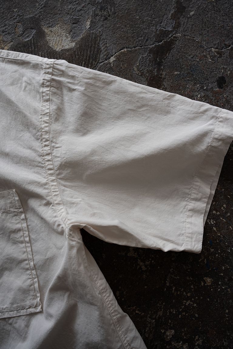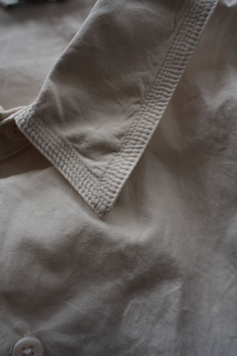 襟に三本針ミシンを走らせ、製品染めしたことで強調されたパッカリングが印象的です。