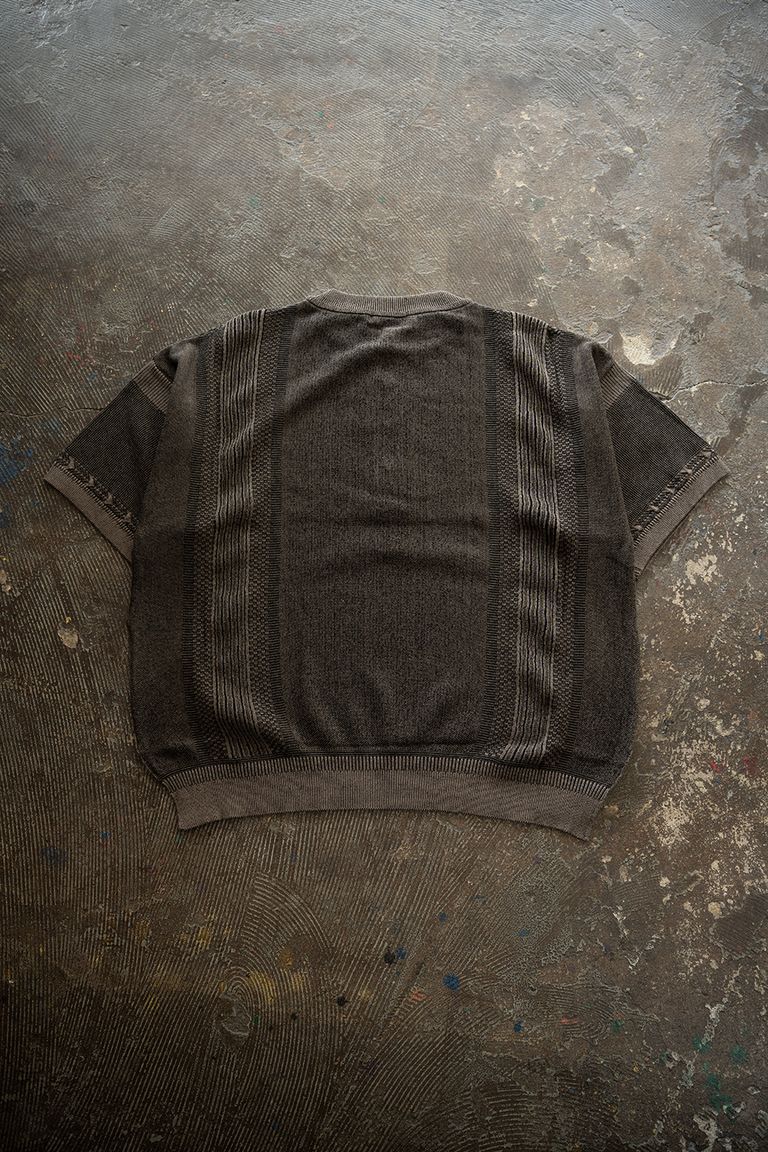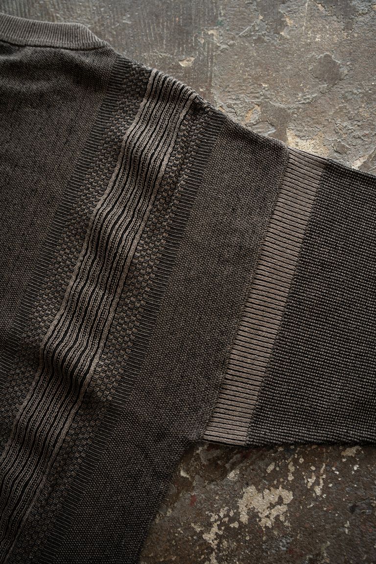 こちらの作品で使用している生地は、12ゲージの編み機に40番手双糸を2本取りして編み立てております。他の作品よりも薄く、軽く仕上げておりますので、夏場も涼しく着用が可能です。